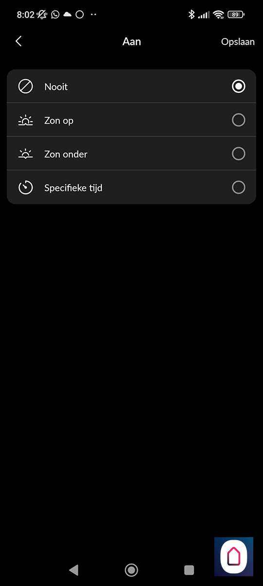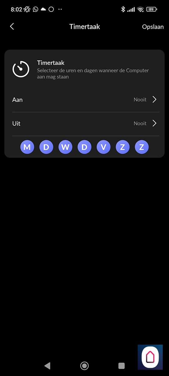 Hiermee kun je aangeven op welke dagen en tijdstippen de tussenstekker aan of uit mag staan. Dit kan bv handig zijn voor je TV welke in de nacht niet aan hoeft te staan. Je kunt schakelen per dag/tijd of op zonsondergang op zonsopgang.