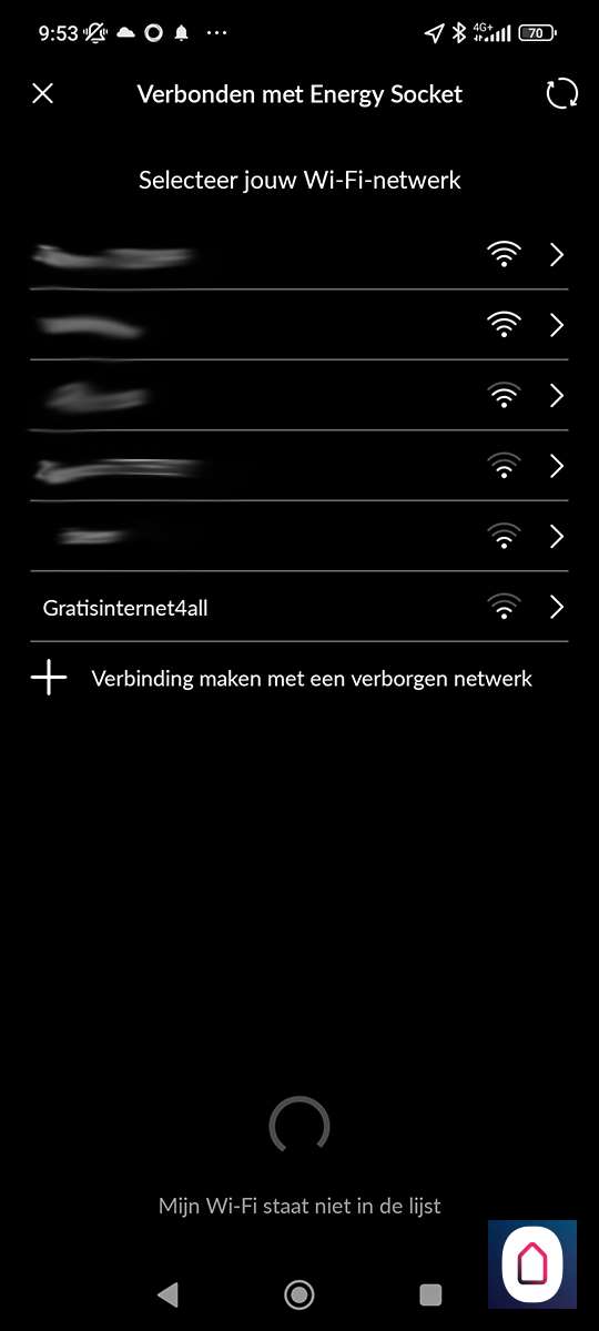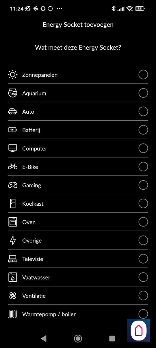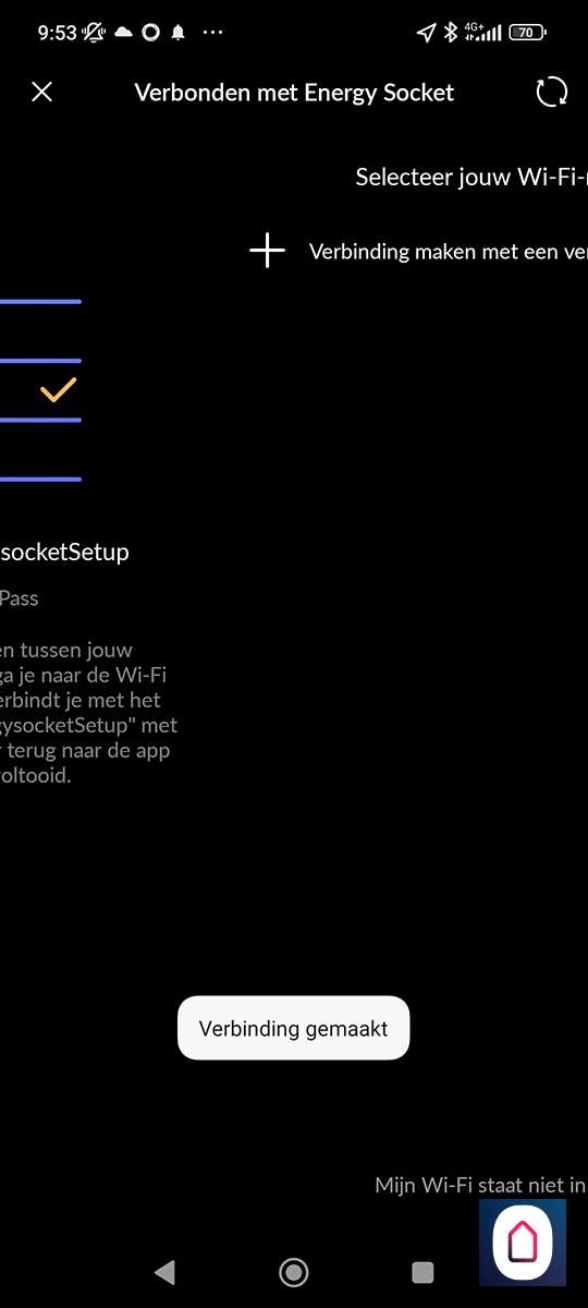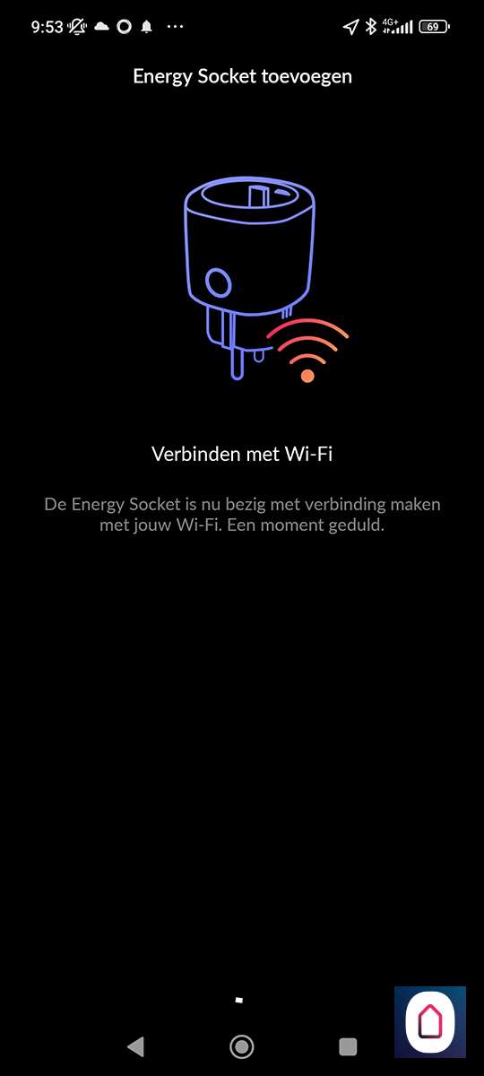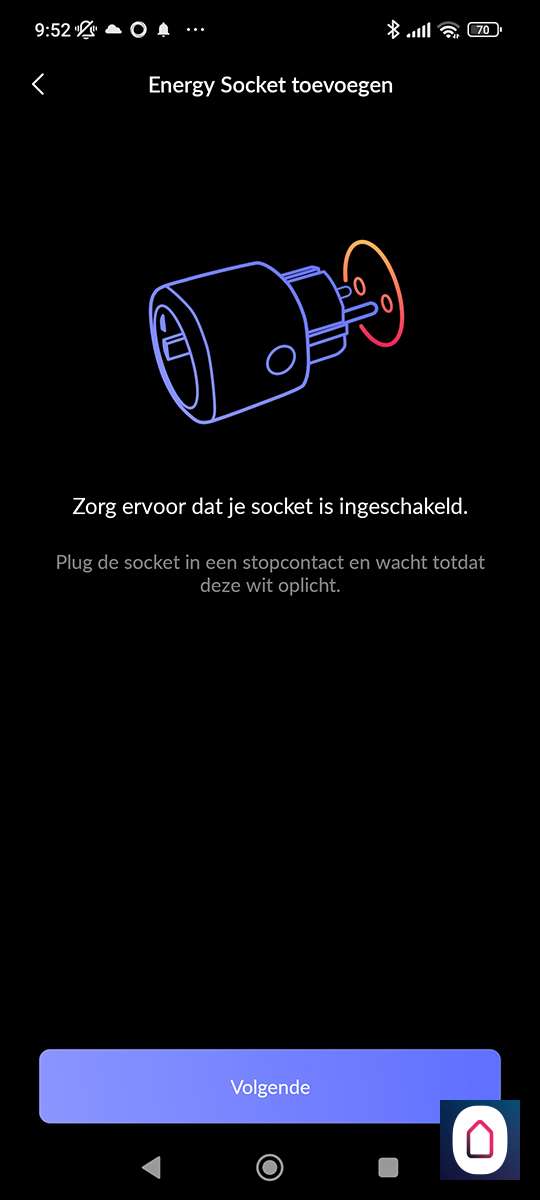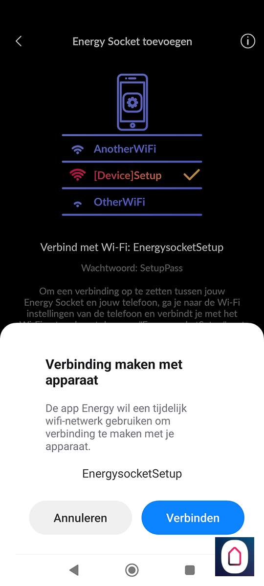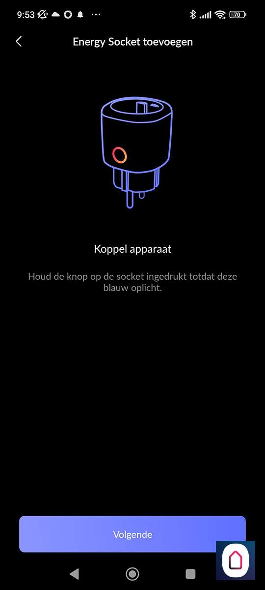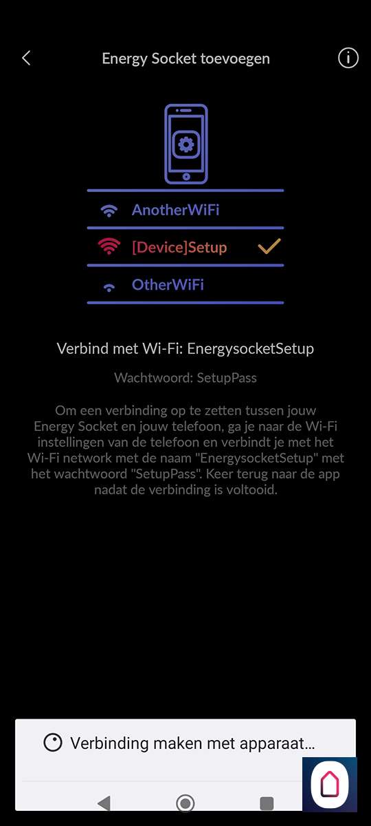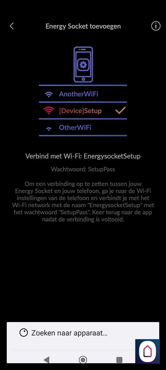 Hierna is het een kwestie van te drukken op "nieuw apparaat toevoegen" en de Energy Socket te op te zoeken. Helaas zien we de nieuwe versie er niet tussen staan, dus proberen we de oude maar. Nu stoppen we de tussenstekker in het stopcontact. De LED zal wit oplichten. Vervolgens houden we het knopje aan de bovenkant ingedrukt zodat de LED blauw oplicht. Nu staat de plug in hotspot modus en kan je met je telefoon daar naar verbinden. Zorg dat je dichtbij je WiFi router bent en dichtbij de plug met je telefoon. Als de verbinding is gelukt zal de LED groen oplichten.