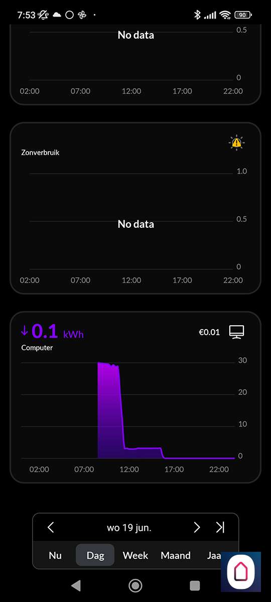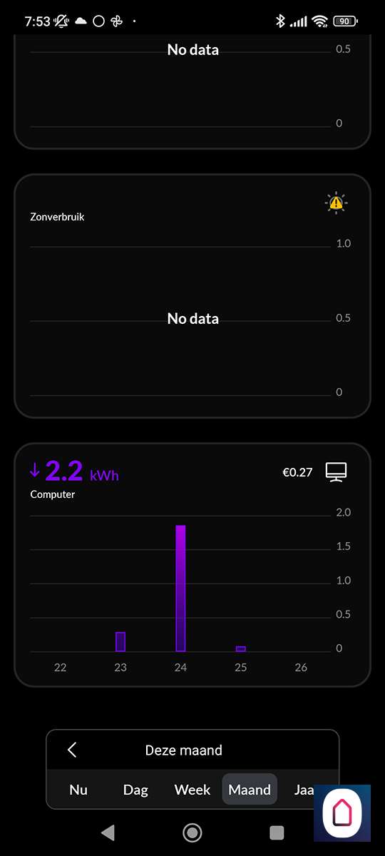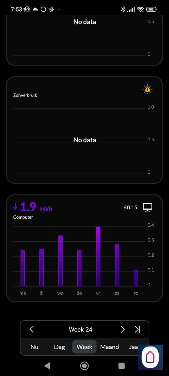 Als we terug gaan naar het hoofdscherm zien we nu prijzen verschijnen per dag/week/maand en per jaar. Het is jammer dat je de grafiek niet van kWh waardes naar euro's kan zetten.
