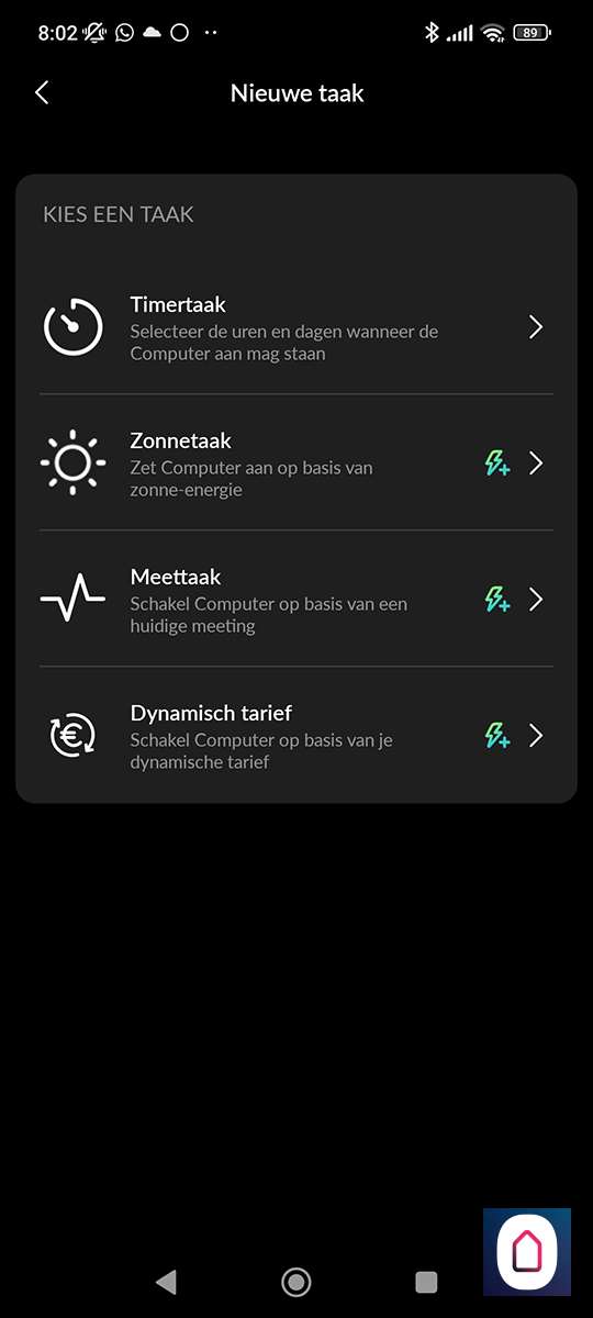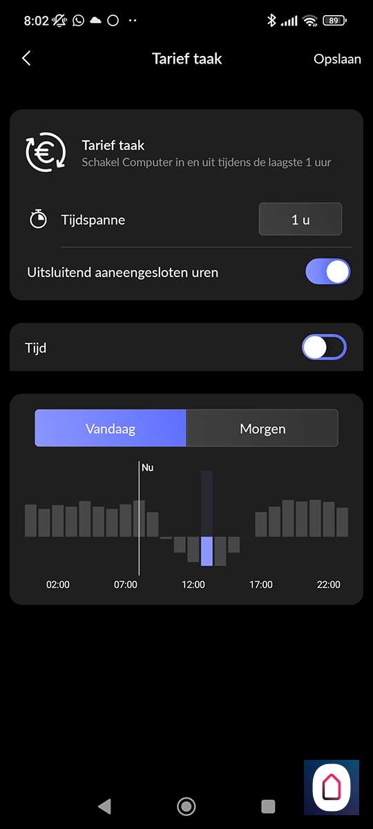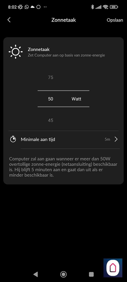 Deze is interessant als je zonnepanelen hebt. Je kunt dan de plug aanlaten zetten als er meer dan x watt aan zonne-energie wordt binnen gehaald. Hierbij kun je ook nog een aan tijd aangeven.