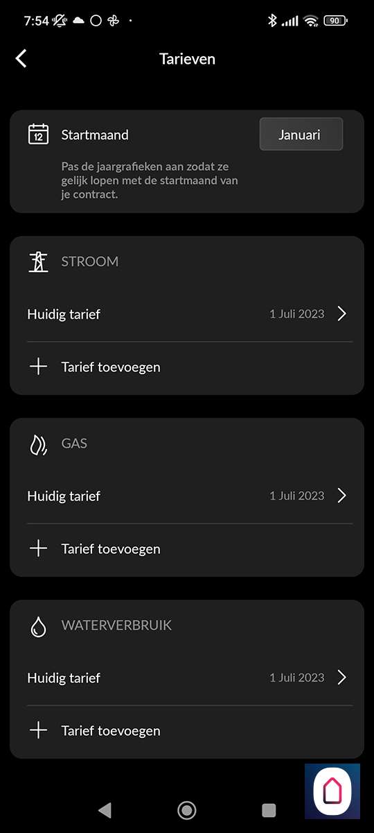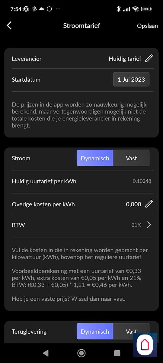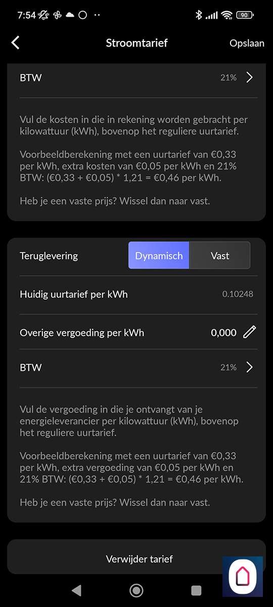 In de APP kun je jouw energie tarief instellen, zo kun je precies zien hoeveel geld een apparaat kost. Dit kan met bedragen van een vast contract en als je een dynamische contract hebt. Hierbij haalt de APP automatisch de dag prijzen op en kun je zelf de overige kosten toevoegen. Als je zonnepanelen hebt kun je hiervoor de bedragen apart invullen.