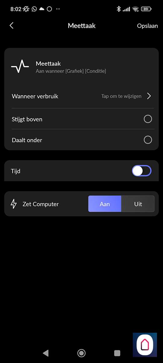 Als laatste heb je nog de meettaak. Deze is bedoelt om op een de plug aan of uit te zetten als het energie verbruik boven of beneden een waarde komt.