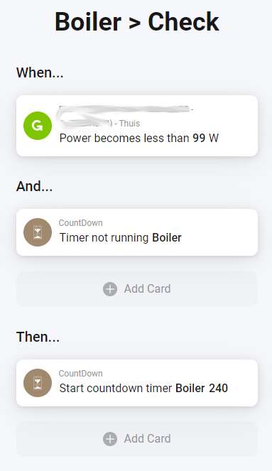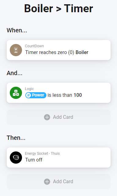 Bij de 2de flow maken we, als de zon opbrengsten lager zijn dan 99 W, dat hij een timer gaat starten. Je zou natuurlijk ook direct de tussenstekker uit kunnen zetten maar hierdoor heb je kans dat hij continue aan/uit gaat door de schommelingen in de opbrengsten. Soms boven 100W en soms onder 100W.