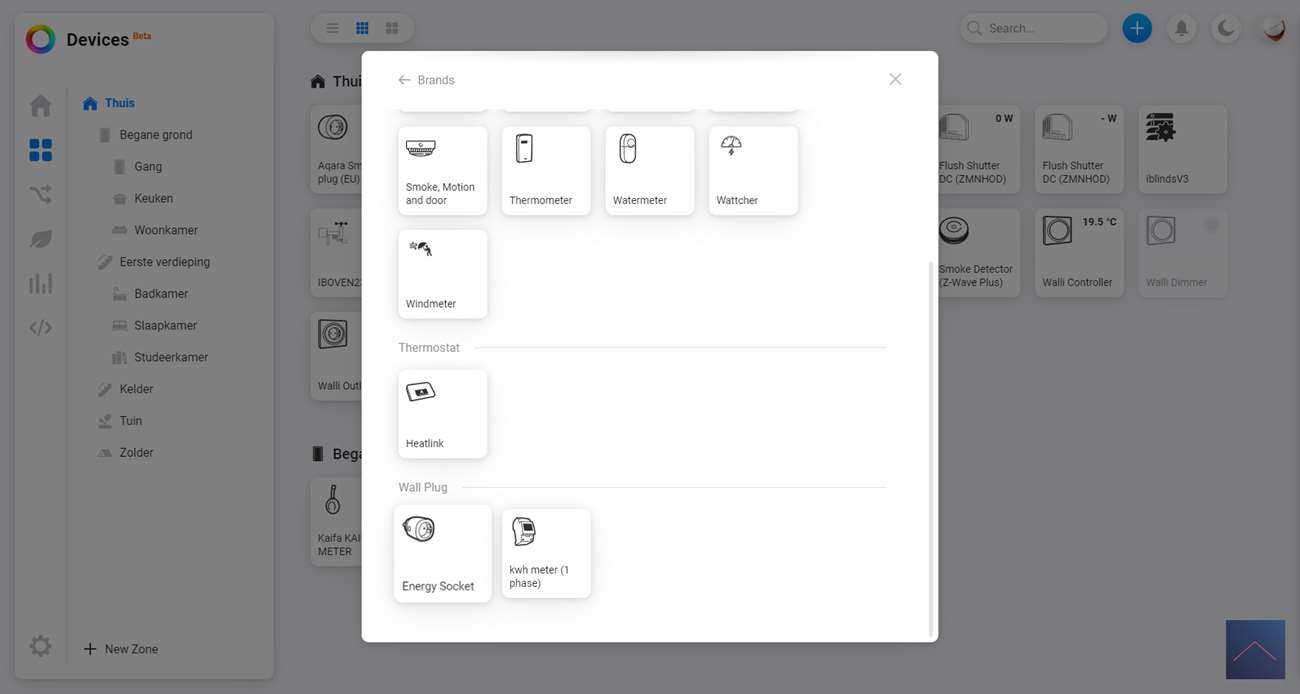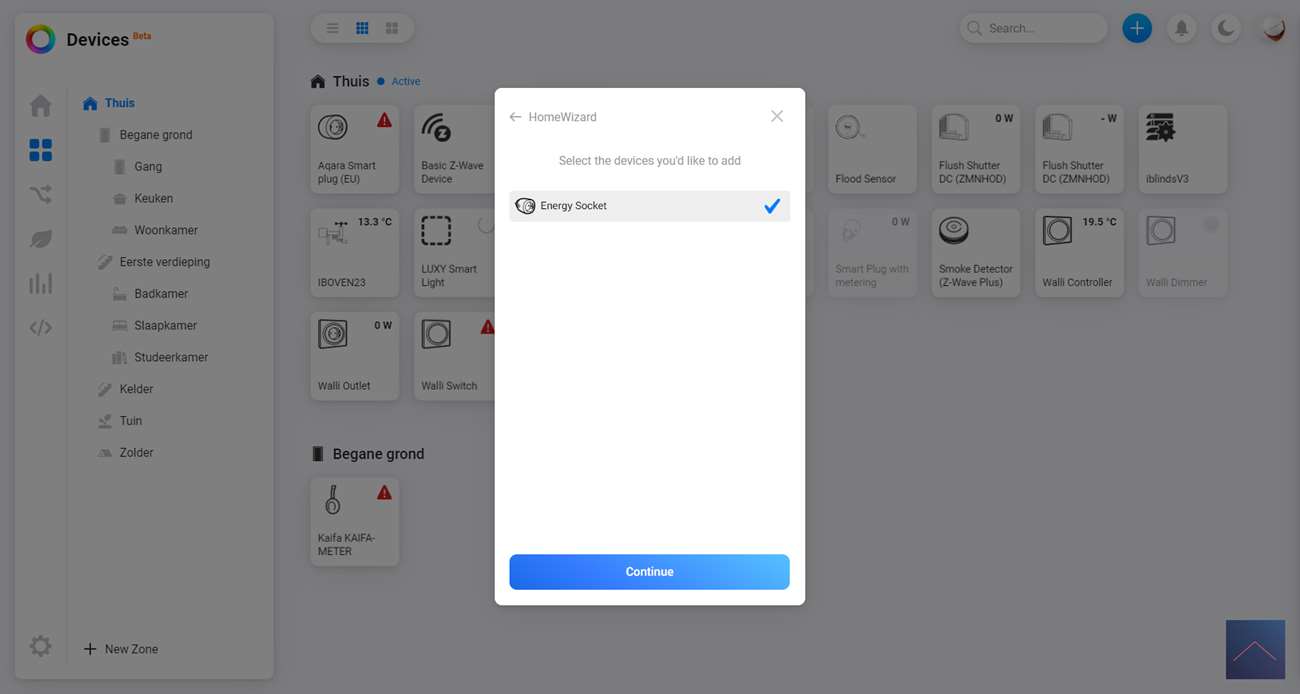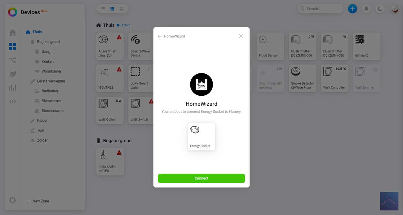 Om hem te koppelen aan de Homey gaan we naar het Homey Dashboard en klikken op het plusje bovenin. Nu zoeken we op HomeWizard en selecteren we de Energy Socket.
