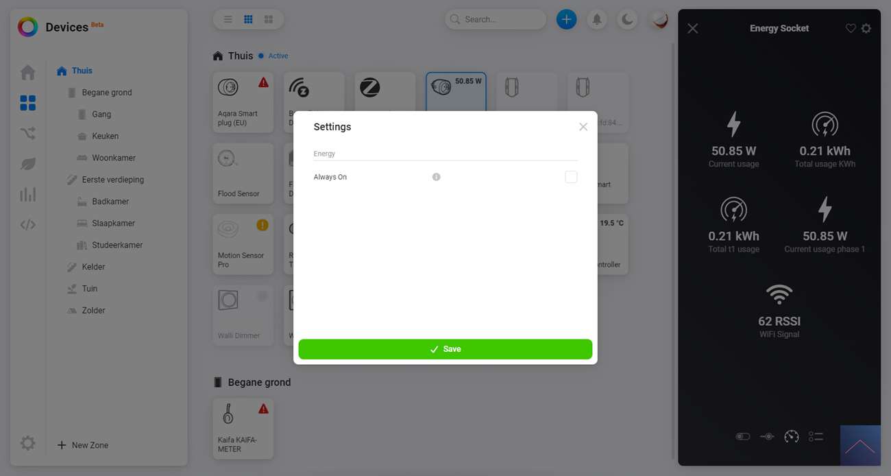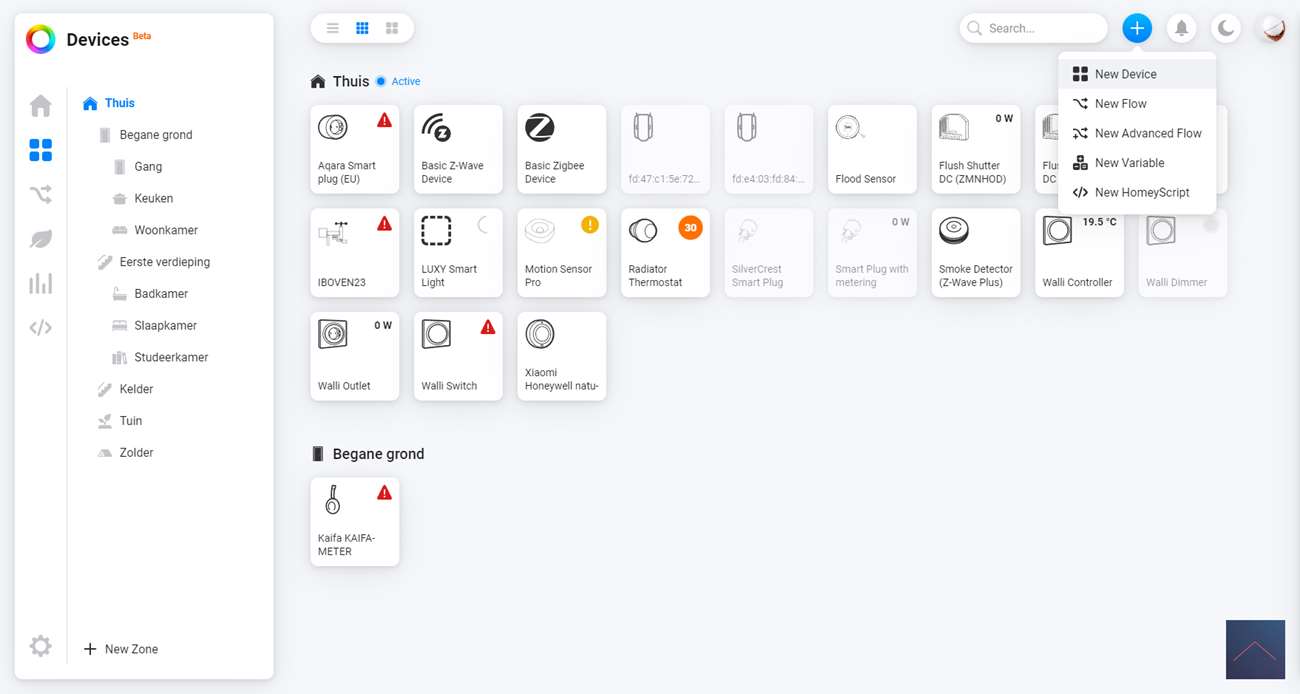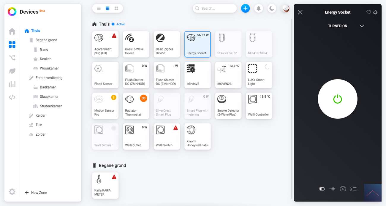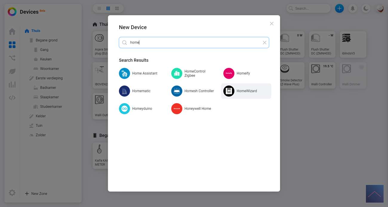 Om hem te koppelen aan de Homey gaan we naar het Homey Dashboard en klikken op het plusje bovenin. Nu zoeken we op HomeWizard en selecteren we de Energy Socket.