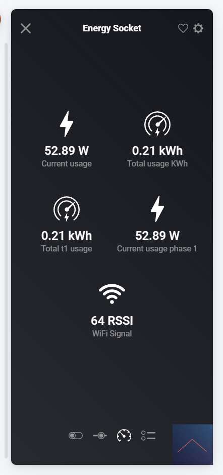 We krijgen een aan- en uitschakelaar, je kunt het dim niveau van de LED veranderen, je ziet het totaal verbruik, huidige verbruik en WiFi signaal.