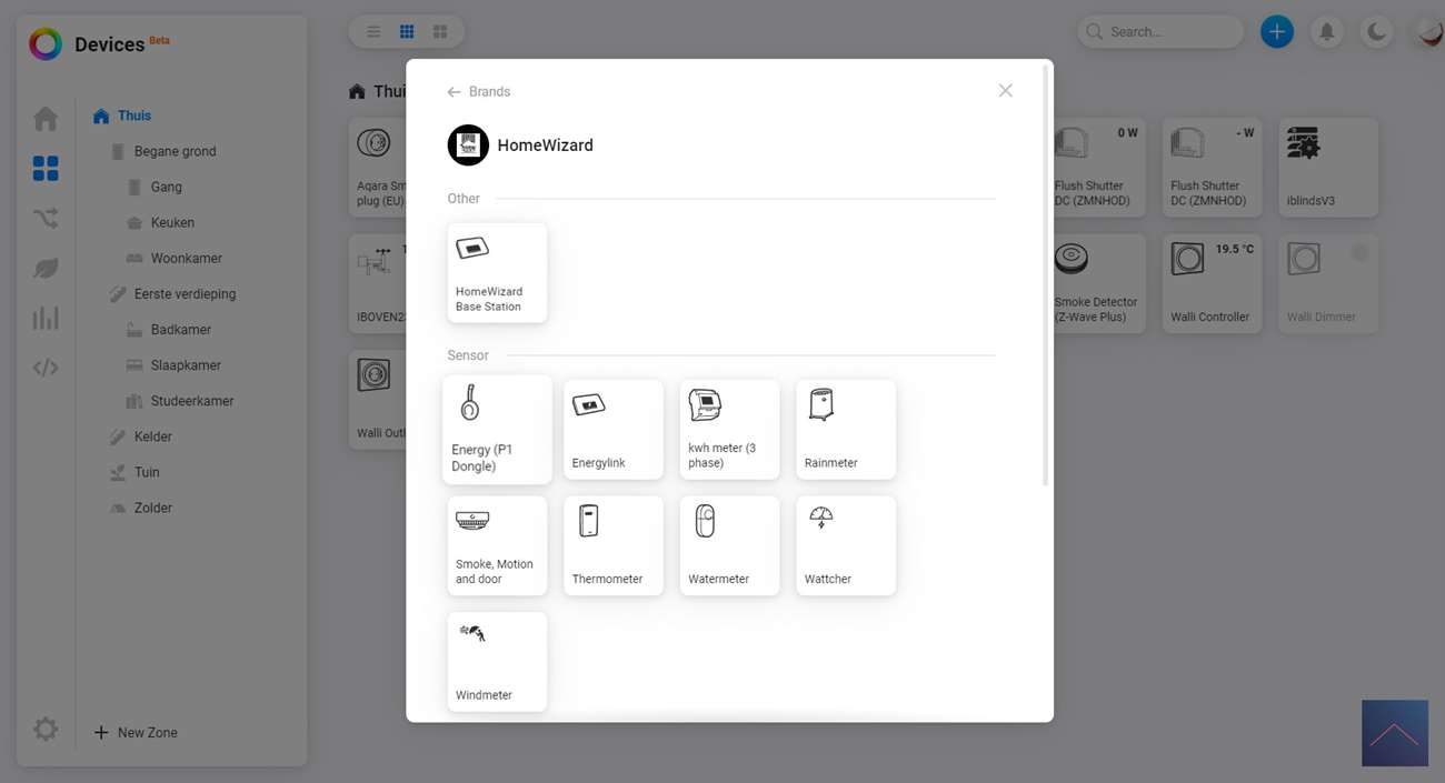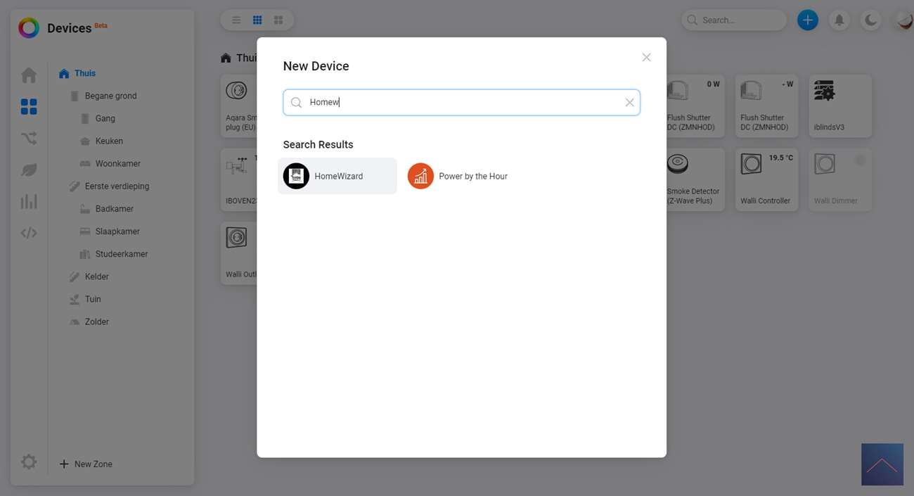 De Homey werkt via APPS om apparaten werkend te krijgen, zonder een APP wordt het heel ingewikkeld. Gelukkig is er een APP voor de HomeWizard P1. Om hem daadwerkelijk toe te voegen gaan we naar het Homey Dashboard en klikken op het plusje bovenin. Nu zoeken we op HomeWizard en selecteren we de P1.