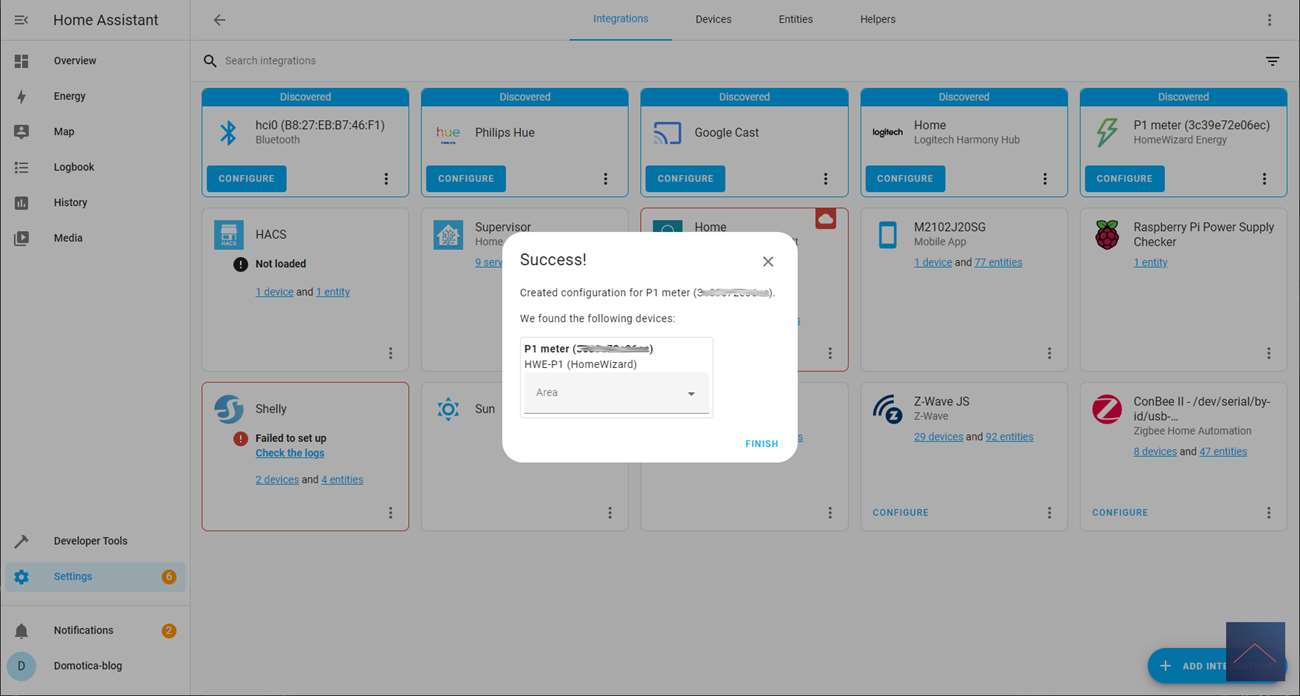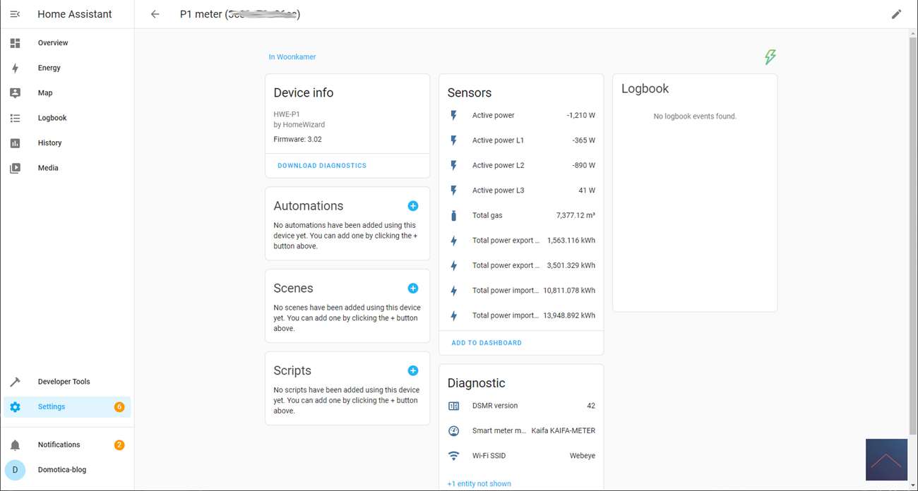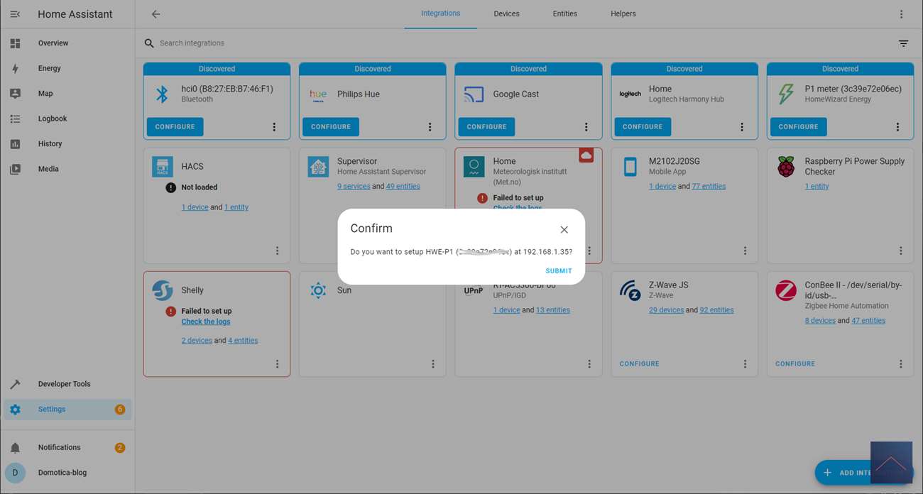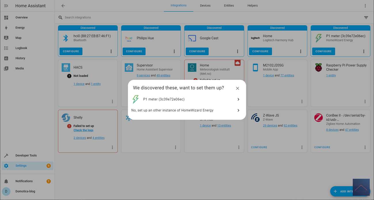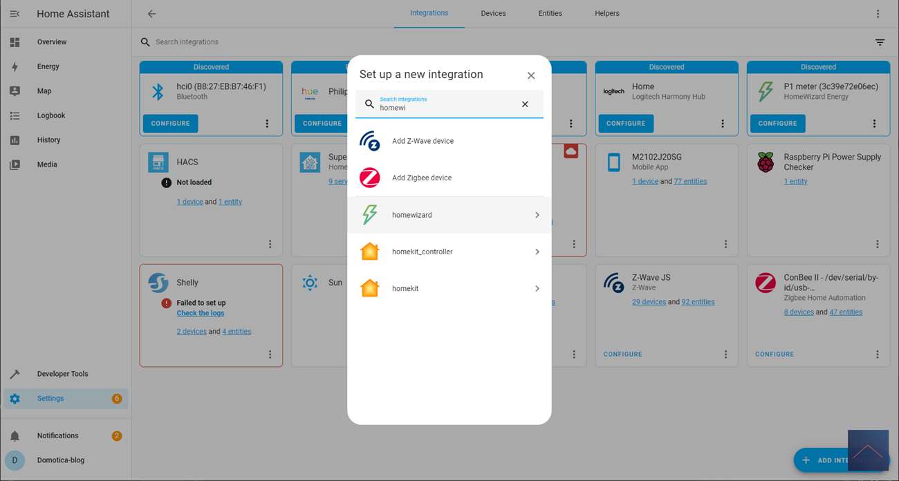 Het installeren is super simpel. Je gaat naar settings, devices, klikt op nieuwe integratie en zoekt daar op HomeWizard. Na een paar klikken is hij toegevoegd. Fijn dat dit allemaal zo vlekkeloos werkt.