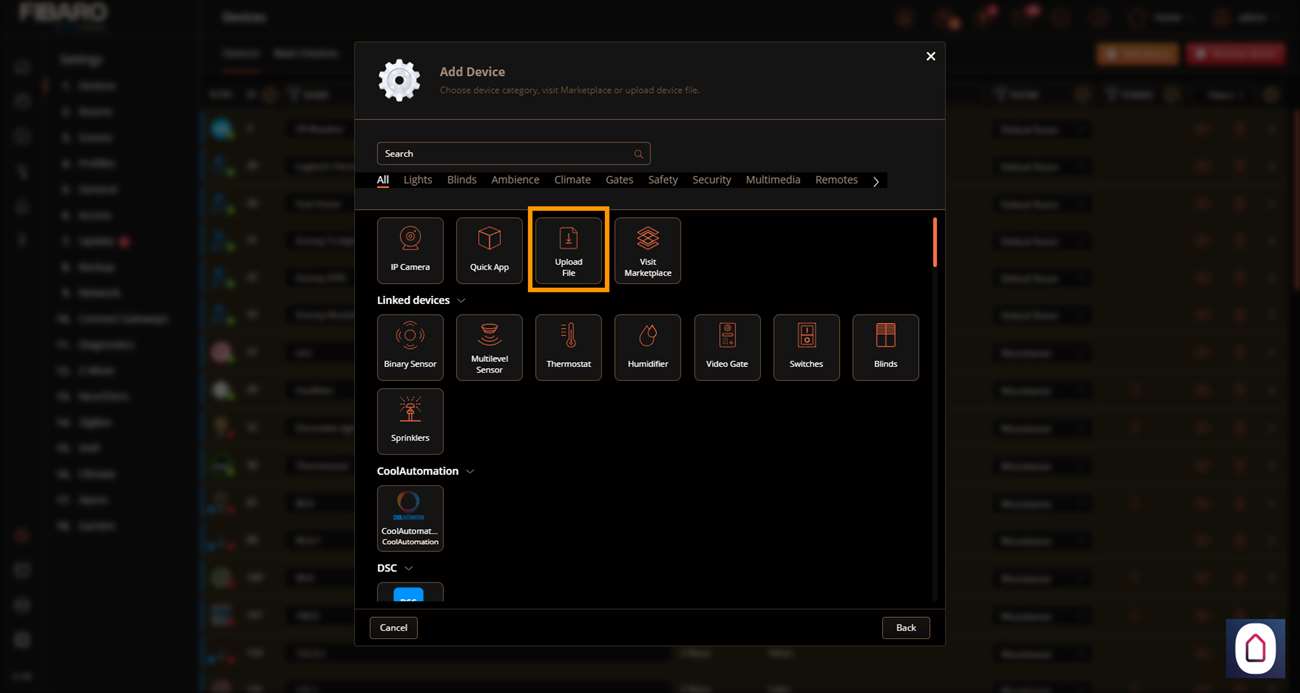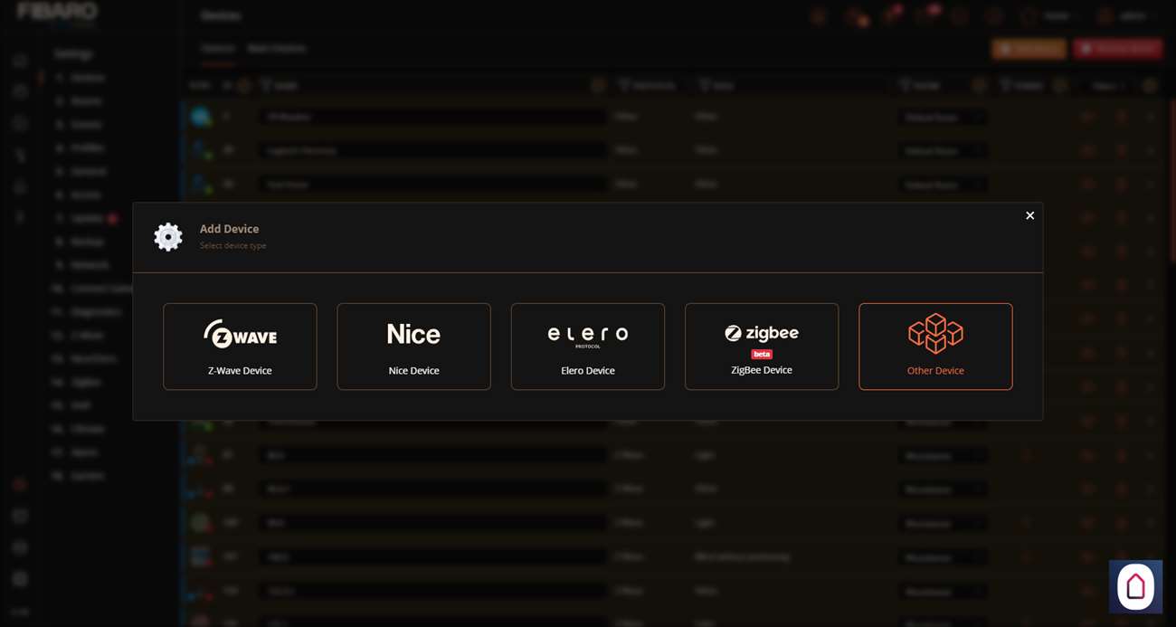Nu loggen we in op de HC3 dashboard en naar onze apparaten en klikken op "add device" en dan op other en kiezen voor "upload file" en selecteren het bestanden wat we net gedownload hebben.