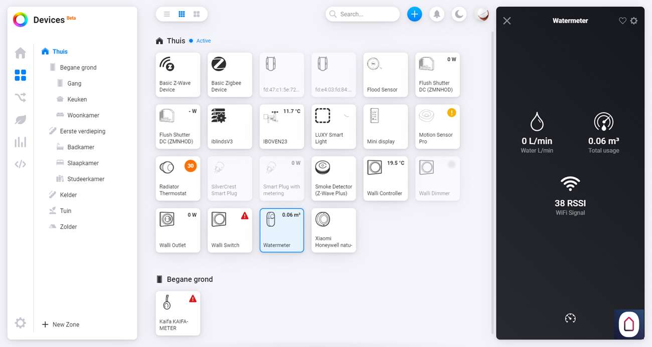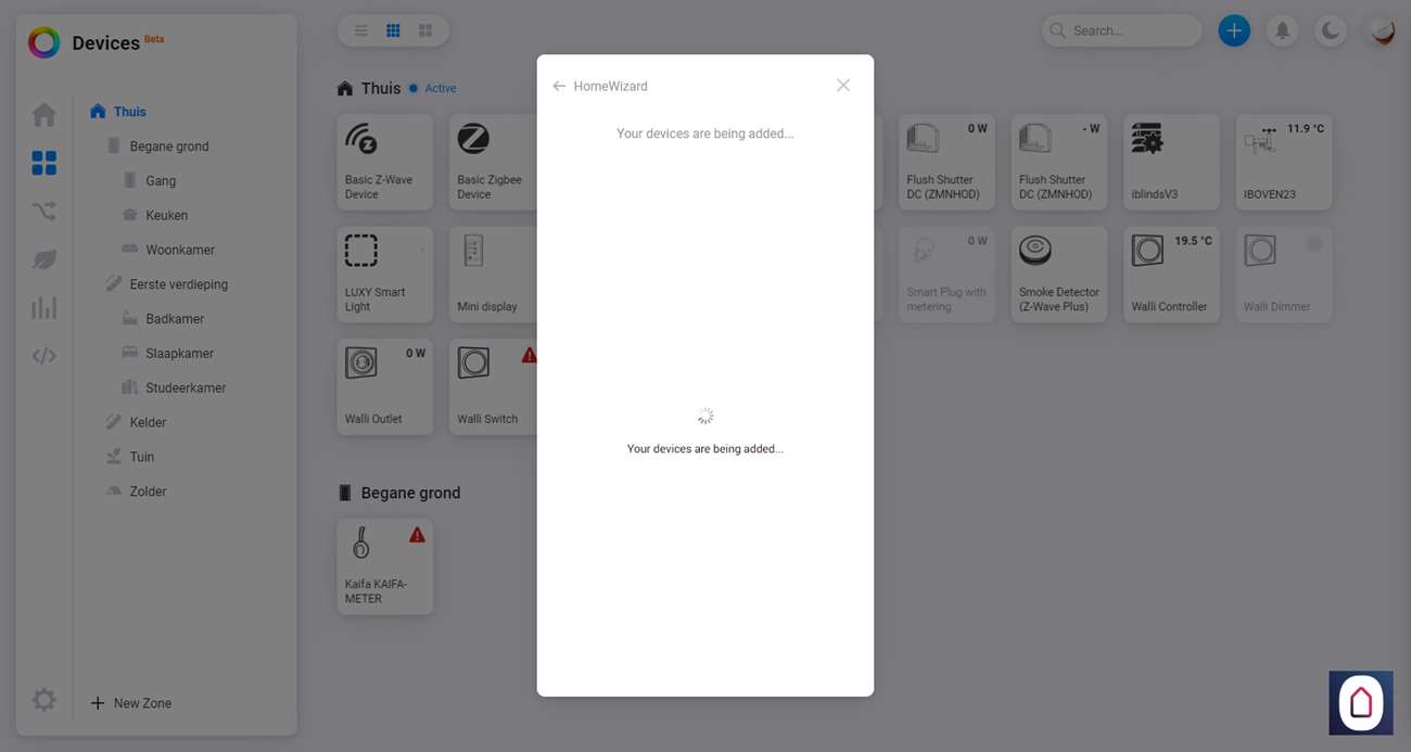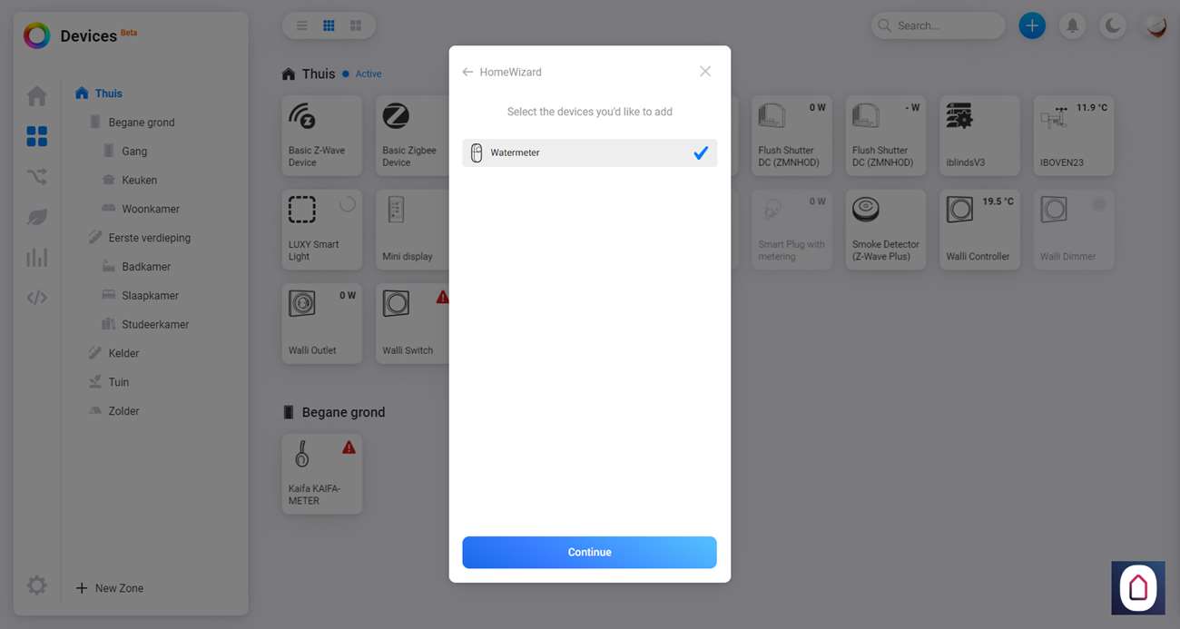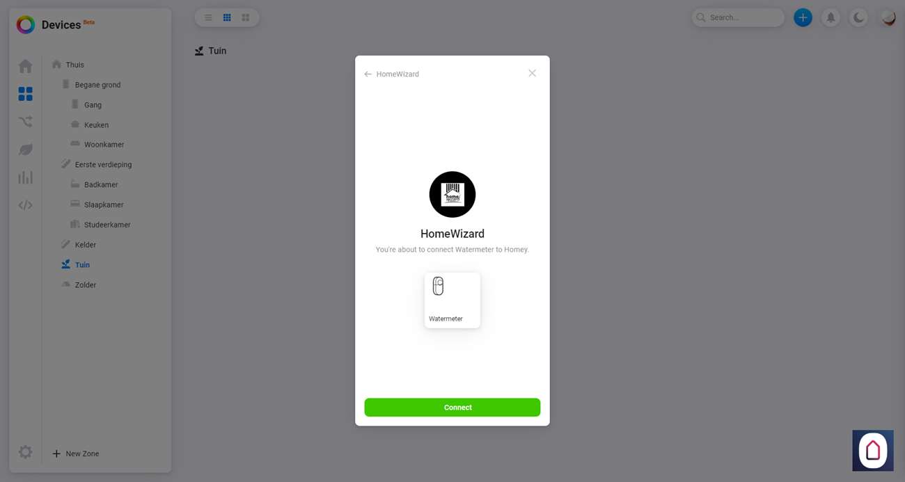 Om hem daadwerkelijk toe te voegen gaan we naar het Homey Dashboard en klikken op het plusje bovenin. Nu zoeken we op HomeWizard en selecteren we de watermeter. Hierna gaat hij direct zoeken naar de meter en hij werd bijna vrij snel gevonden. Na wat stappen zien we hem verschijnen bij mijn apparaten.