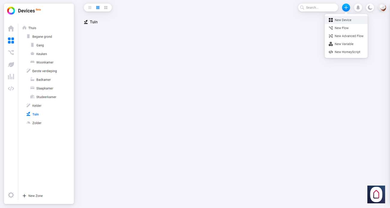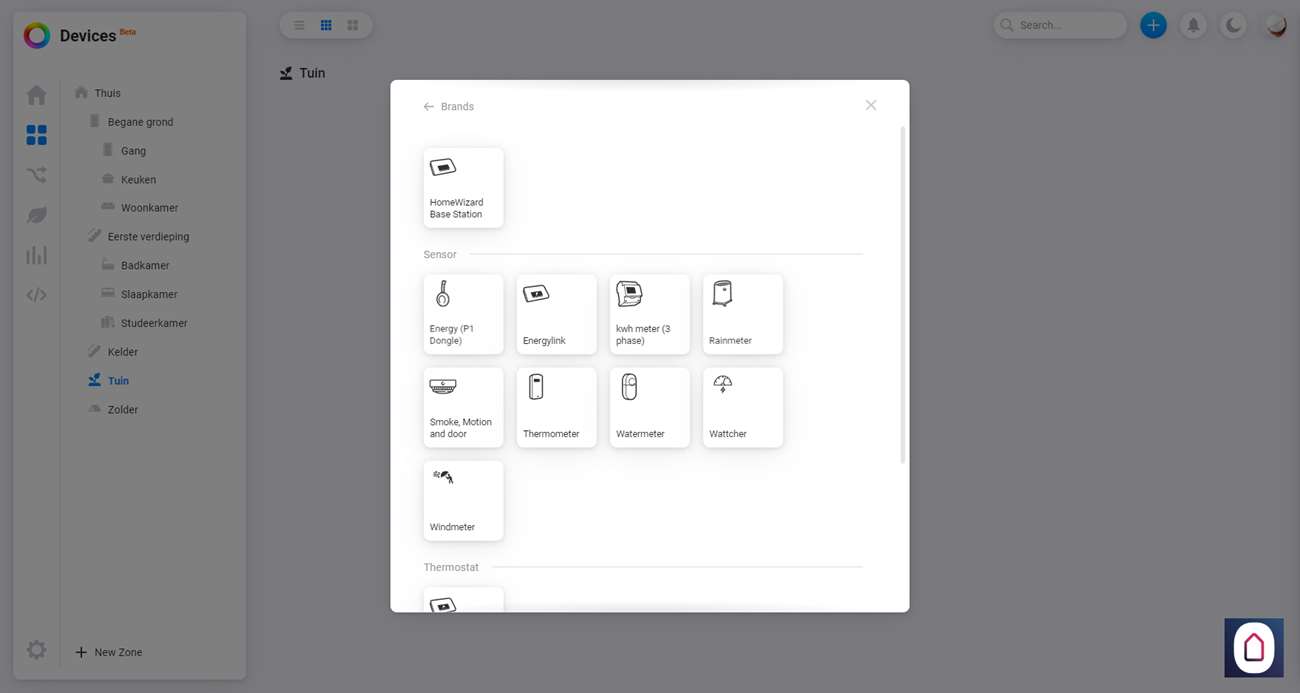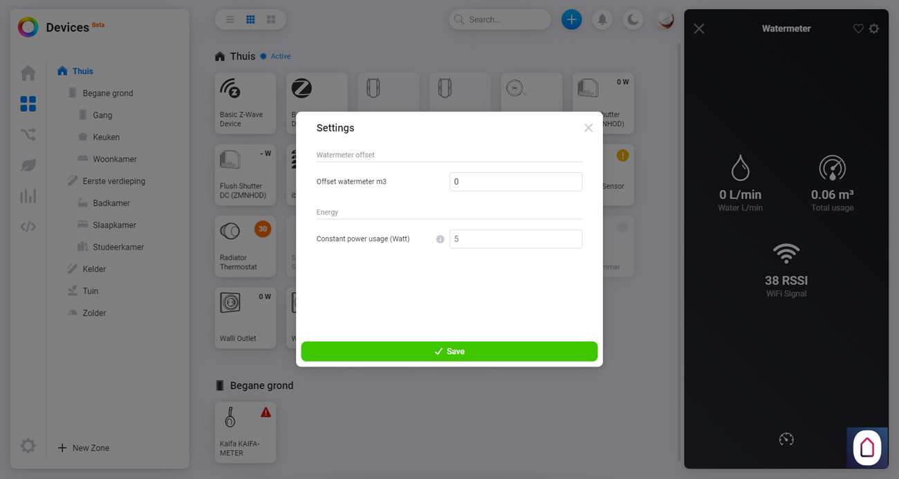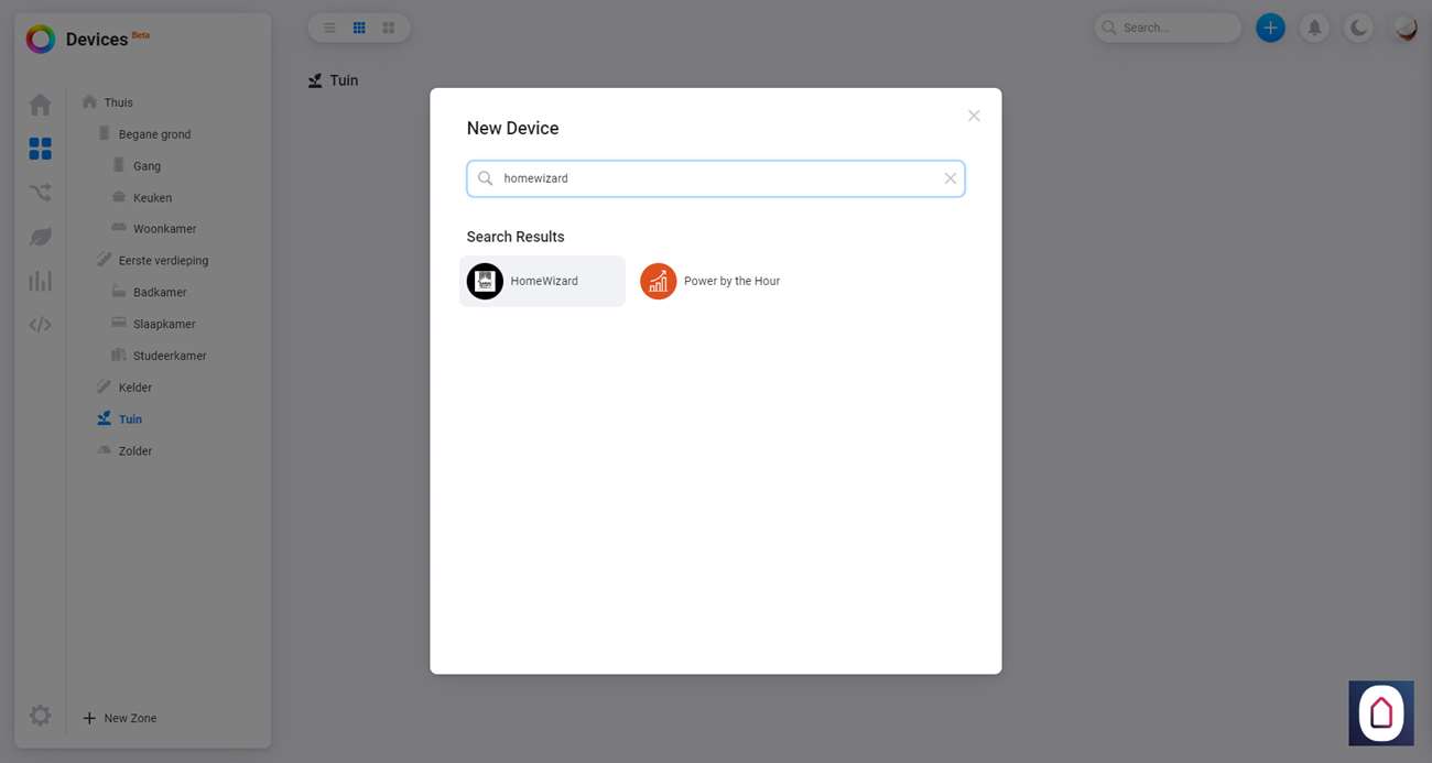 Om hem daadwerkelijk toe te voegen gaan we naar het Homey Dashboard en klikken op het plusje bovenin. Nu zoeken we op HomeWizard en selecteren we de watermeter. Hierna gaat hij direct zoeken naar de meter en hij werd bijna vrij snel gevonden. Na wat stappen zien we hem verschijnen bij mijn apparaten.