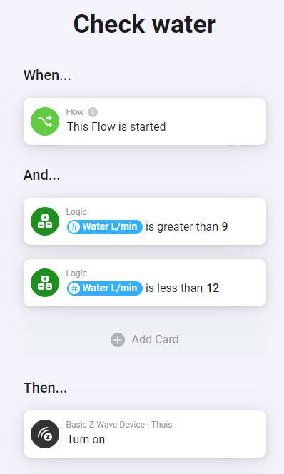 Nu kan het natuurlijk voorkomen dat je bv je wasmachine aanzet en deze ook tussen de 9 en 12 liter verbruikt. In ons geval is dit niet zo. Maar je zou bovenstaande flow kunnen uitbreiden door een extra check te doen na 3 minuten.
