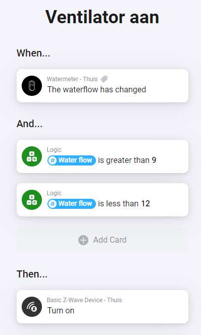 We maken dus een flow: als de waarde tussen de 9 en 12 komt mag hij de ventilator aanzetten.