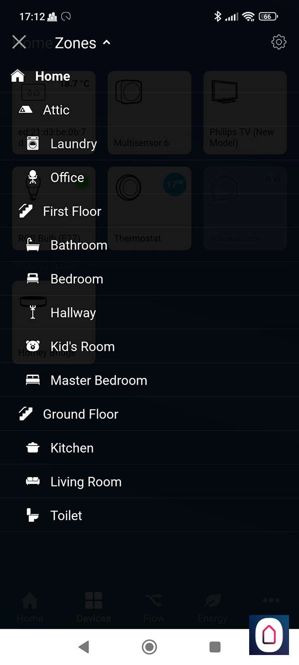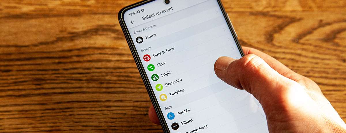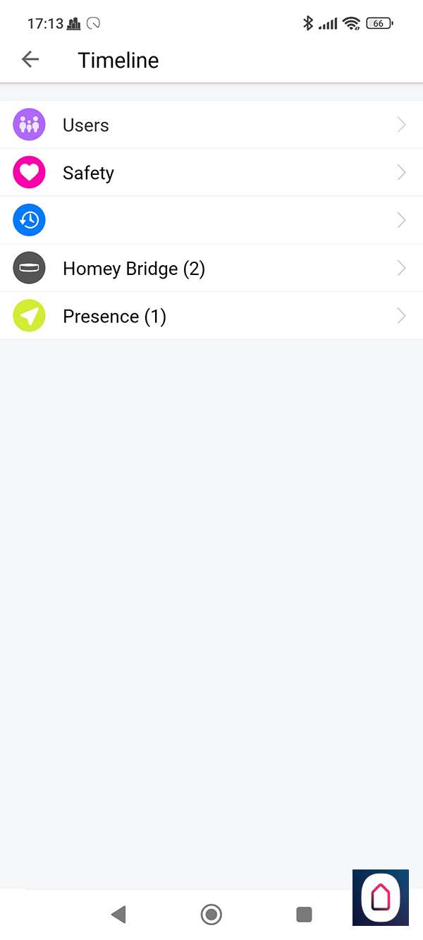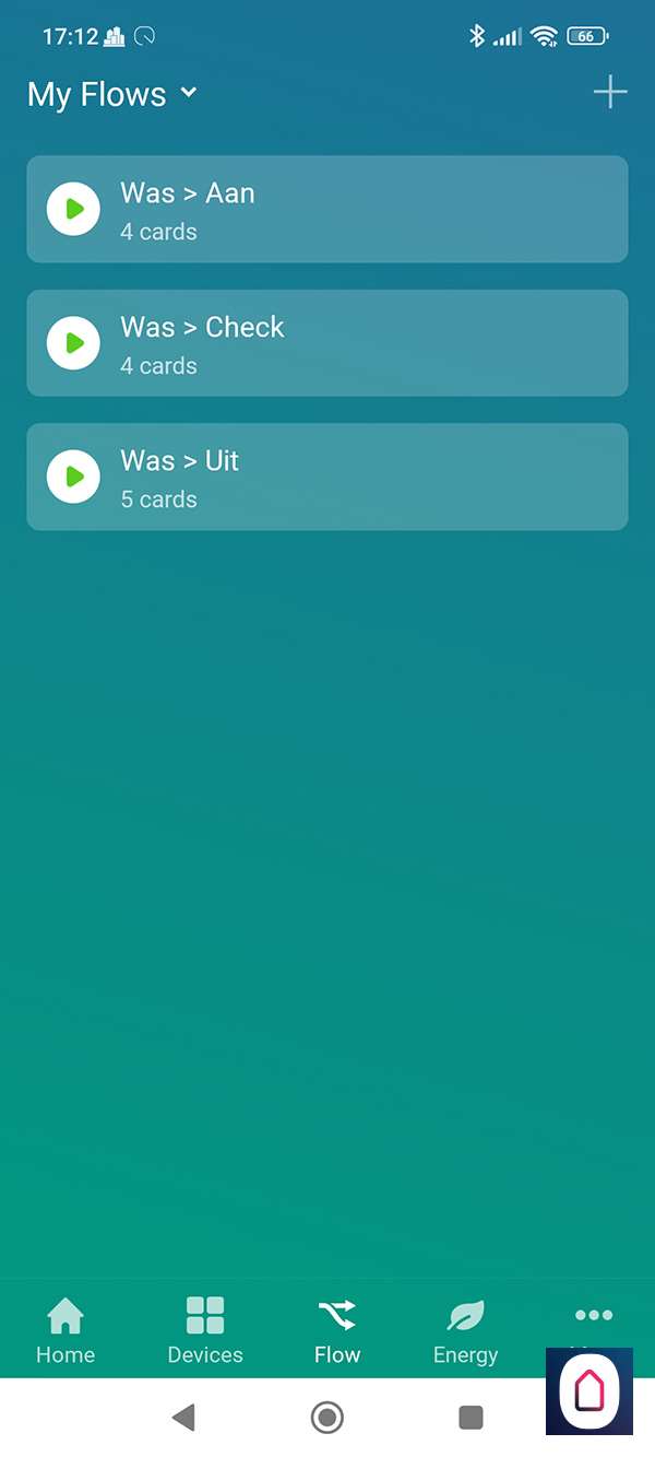 In het startscherm kun je apparaten markeren als favoriet en deze komen dan direct bovenin te staan zodat je ze snel kunt bedienen. Hieronder heb je de mogelijkheid om je favorieten flows neer te zetten. Daar weer onder vind je een time line waar alle gebeurtenissen worden bijgehouden. Je kunt via een flow ook zelf gebeurtenissen toevoegen.