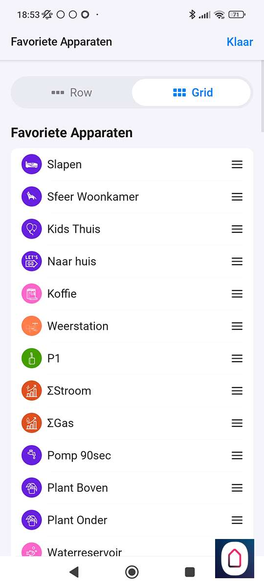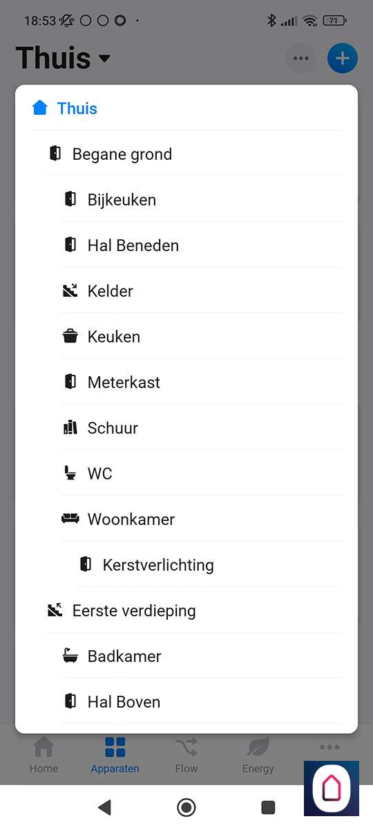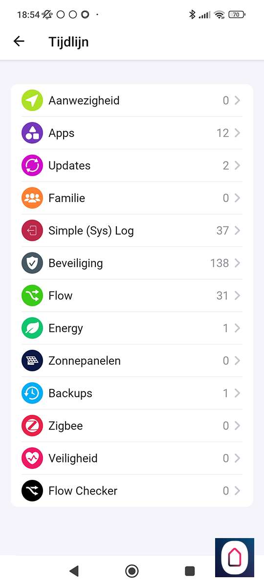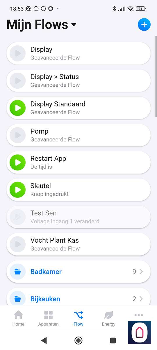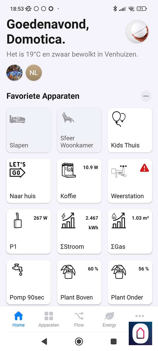 In het startscherm kun je apparaten markeren als favoriet en deze komen dan direct bovenin te staan zodat je ze snel kunt bedienen. Hieronder heb je de mogelijkheid om je favorieten flows neer te zetten. Daar weer onder vind je een timeline waar alle gebeurtenissen worden bijgehouden. Je kunt via een flow ook zelf gebeurtenissen toevoegen. Bij een kaartje heb je ook de mogelijkheid om direct een waarde te laten zien; zoals bv de temperatuur, stroomverbruik of luchtvochtigheid. Kortom in je startscherm staat dus direct wat je nodig hebt.