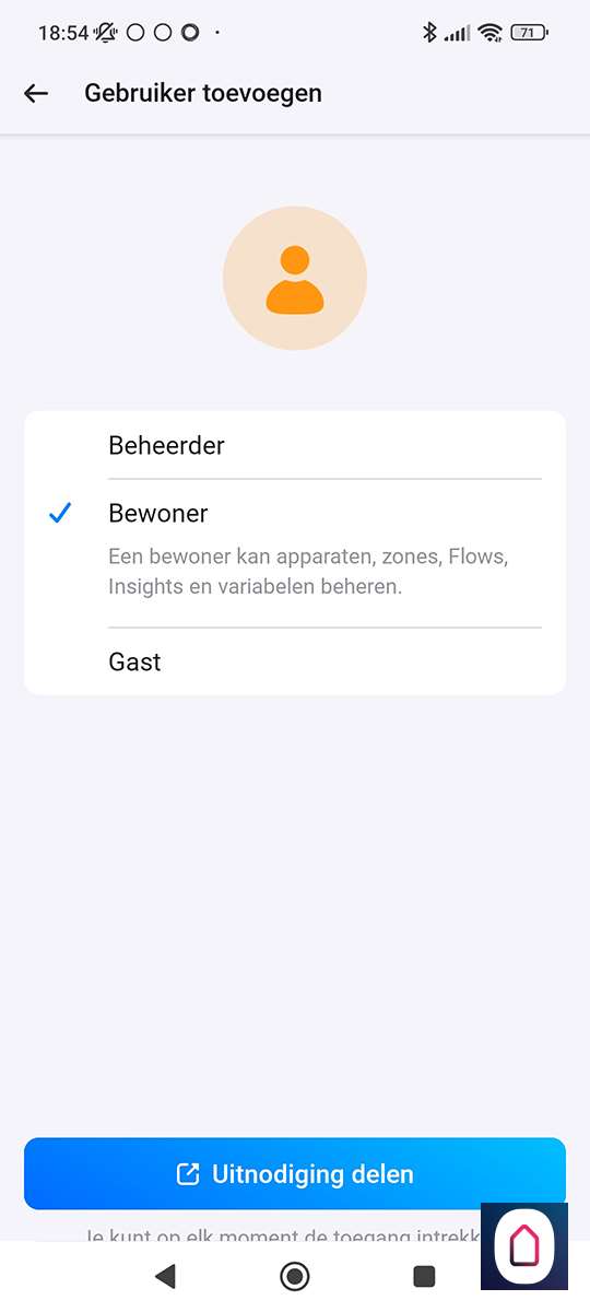 In het gebruikersgedeelte kun je iemand toegang geven tot jouw Homey. Het is niet mogelijk om verschillende rollen/rechten toe te kennen, een gebruiker mag dus alles.