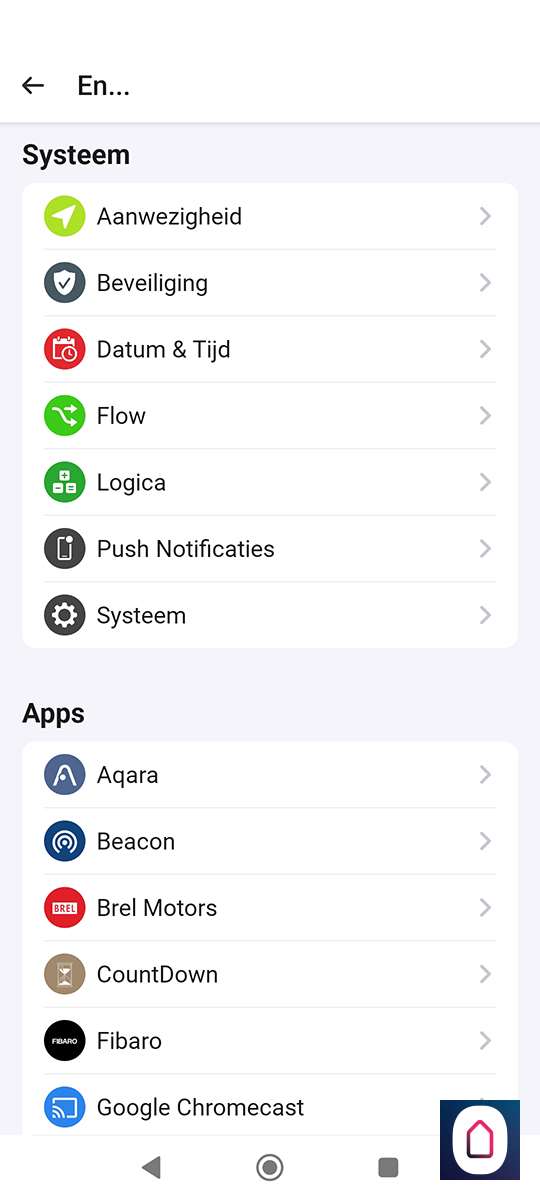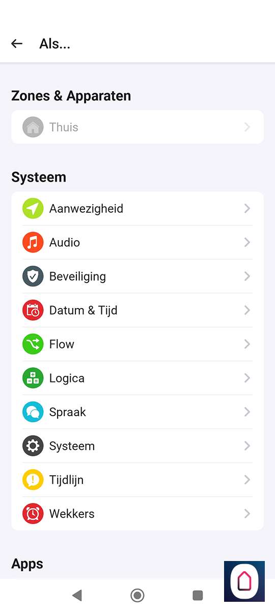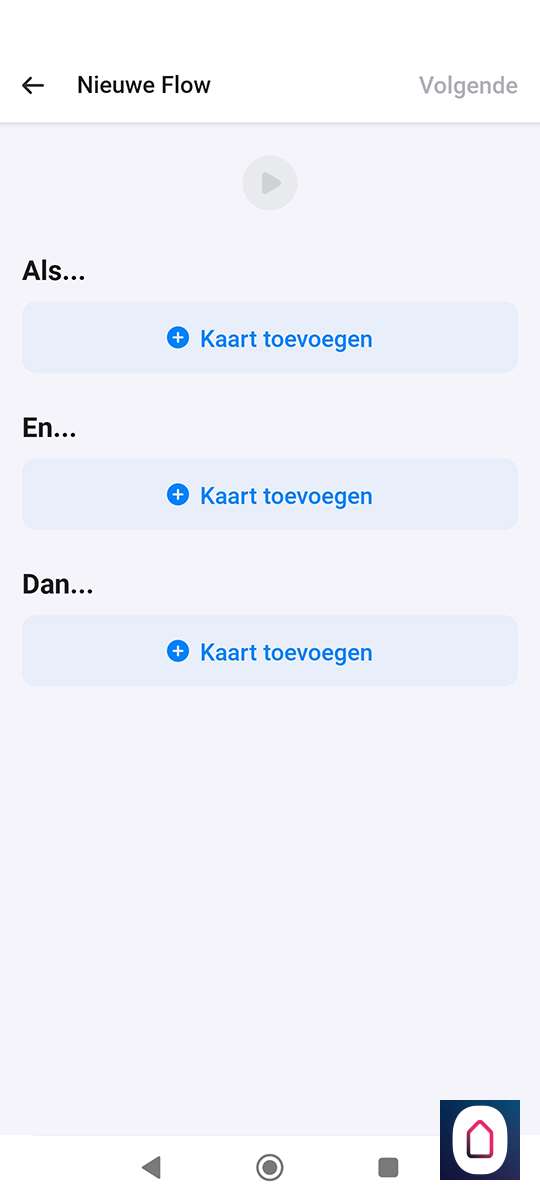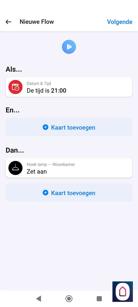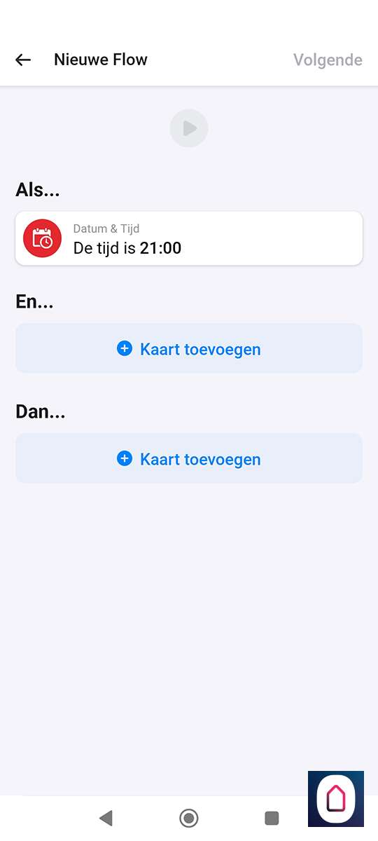 Laten we beginnen met een simpel voorbeeld. We willen regelen dat een lamp om 20.00 uur aangezet wordt. Je gaat hiervoor via de APP naar het flow gedeelte en maakt een nieuwe aan.