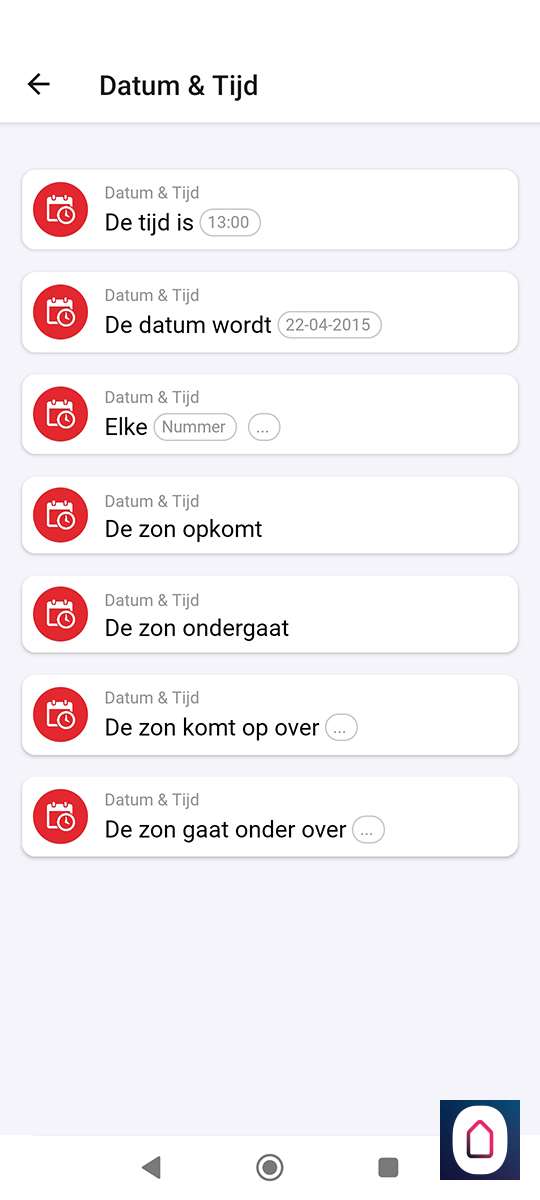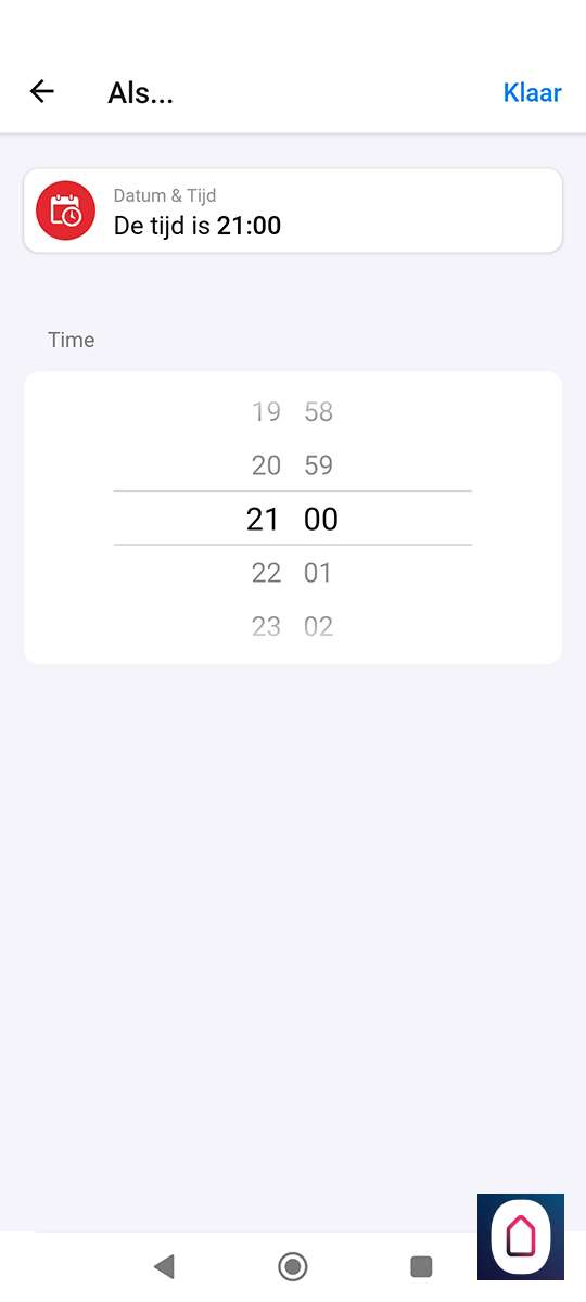 Bij de trigger/ALS zorgen we dat er een kaartje komt. Als je een nieuw kaartje aanmaakt krijg je een selectie van gebeurtenissen. Wij willen graag op tijd schakelen dus selecteren de gebeurtenis Datum & Tijd om vervolgens "de tijd is" te selecteren. We stellen de tijd in op 20.00 uur want dan willen we dat de lamp aan gaat.