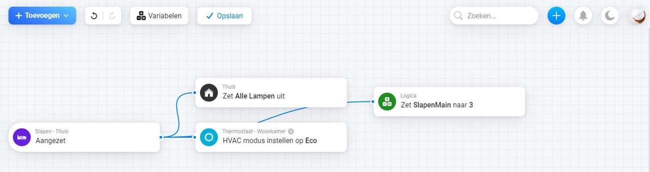 We hebben een flow dat als we naar bed gaan alle apparaten uitgaan, de verwarming lager gezet wordt. Deze starten we op door tegen Google Home te zeggen "Hee Google, slapen". Hij is zelf zo slim dat hij wat lampen naar boven aanzet en als we in bed liggen pas echt alles uitzet. Zo loop je nooit in het donker en staat er 's nachts niks onnodig aan.