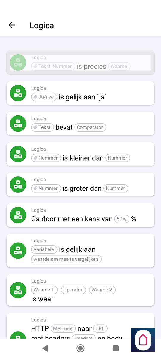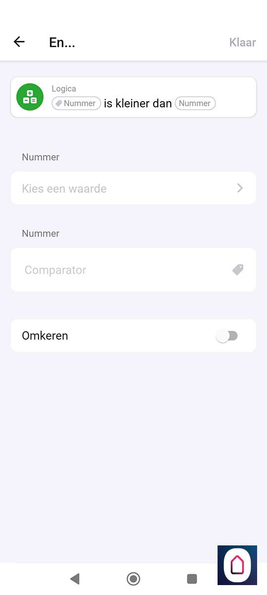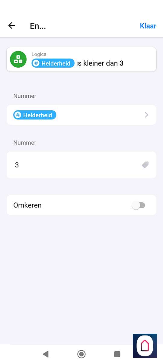 Nu moeten we nog als voorwaarde toevoegen dat als de licht sensor onder de 3 lux is, de flow verder mag. Hiervoor moet je de logica kaart gebruiken. Met deze kaart kun je variabelen instellen, opvragen en controleren (gelijk aan, kleiner, groter, etc). Dit is vooral handig als je wat complexere regels wilt maken.