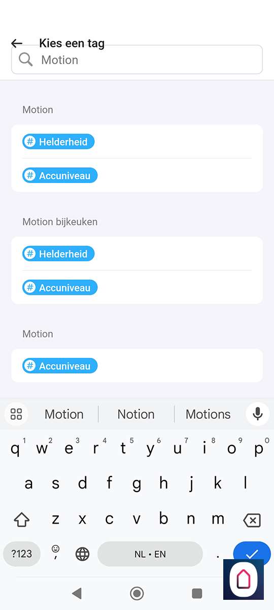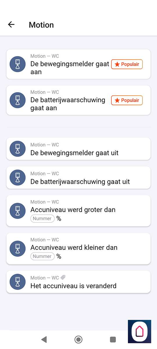 In de ALS kolom (trigger) gebruiken we de bewegingssensor. Dus selecteren we de sensor in de ALS kolom en geven aan dat hij mag starten als er beweging is.