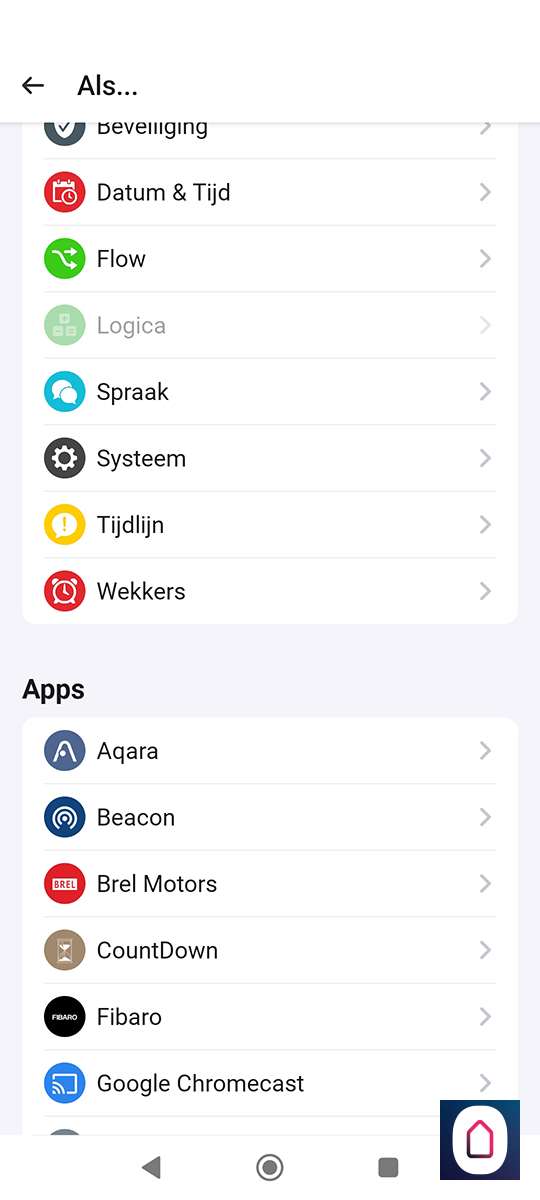 Om regels te maken wordt er gebruik van de ALS/EN/DAN manier. Oftewel ALS er iets gebeurt, voer DAN een actie uit. Hiervoor zijn 3 rijen gemaakt, waar je apparaten, APP's, notificaties en variabelen in kunt zetten. In het "EN" vlak kun je ook nog een "OF" gebruiken, super handig om je hoeveelheid regels te beperken.