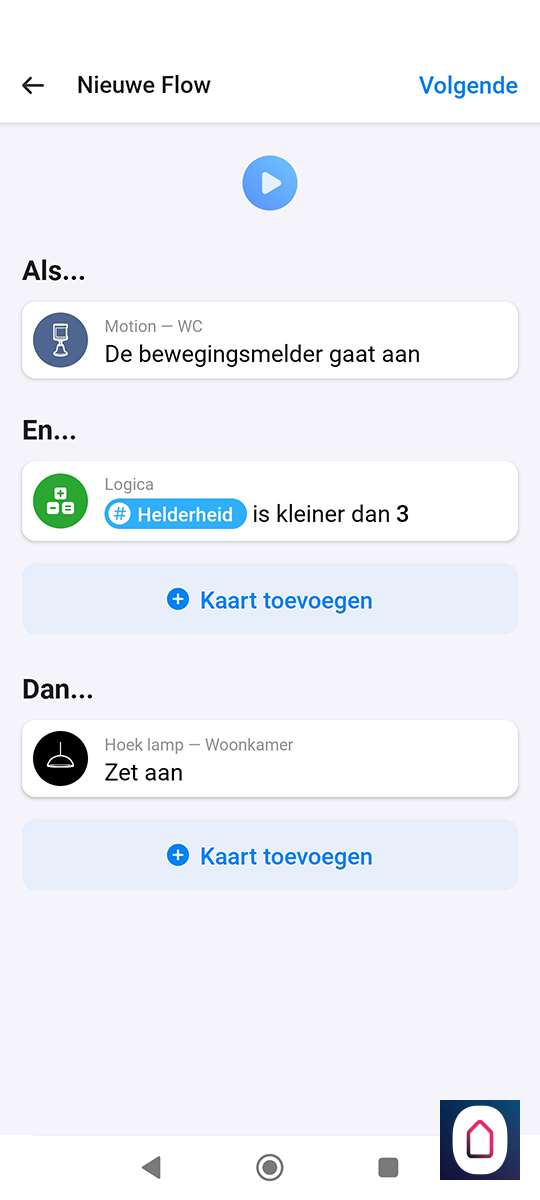 Nu hebben we een redelijk eenvoudige flow gemaakt. Laten we in ons tweede voorbeeld een wat ingewikkelder voorbeeld maken. We gaan maken dat bij beweging, en het is donker, dat dan de lamp aangezet moet worden.