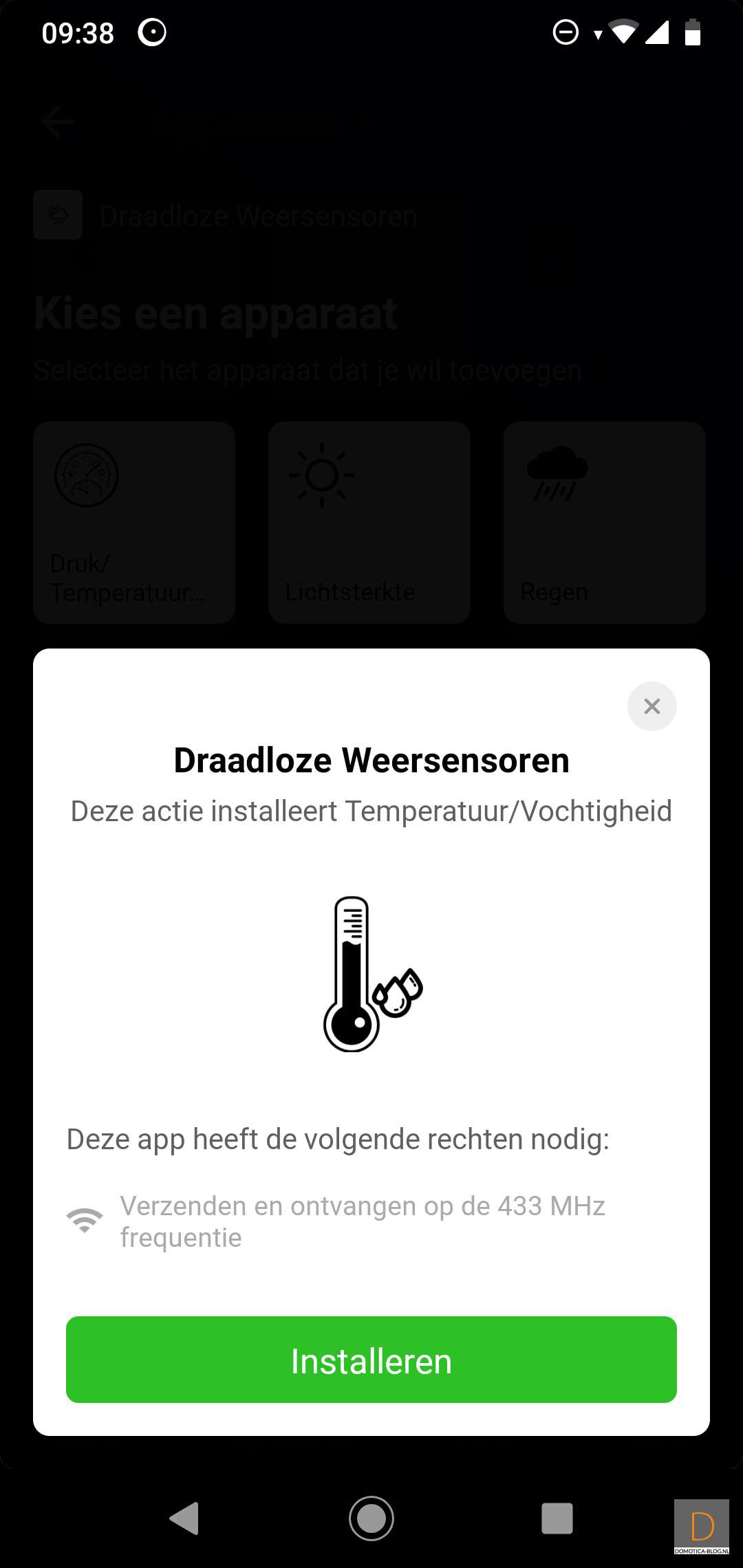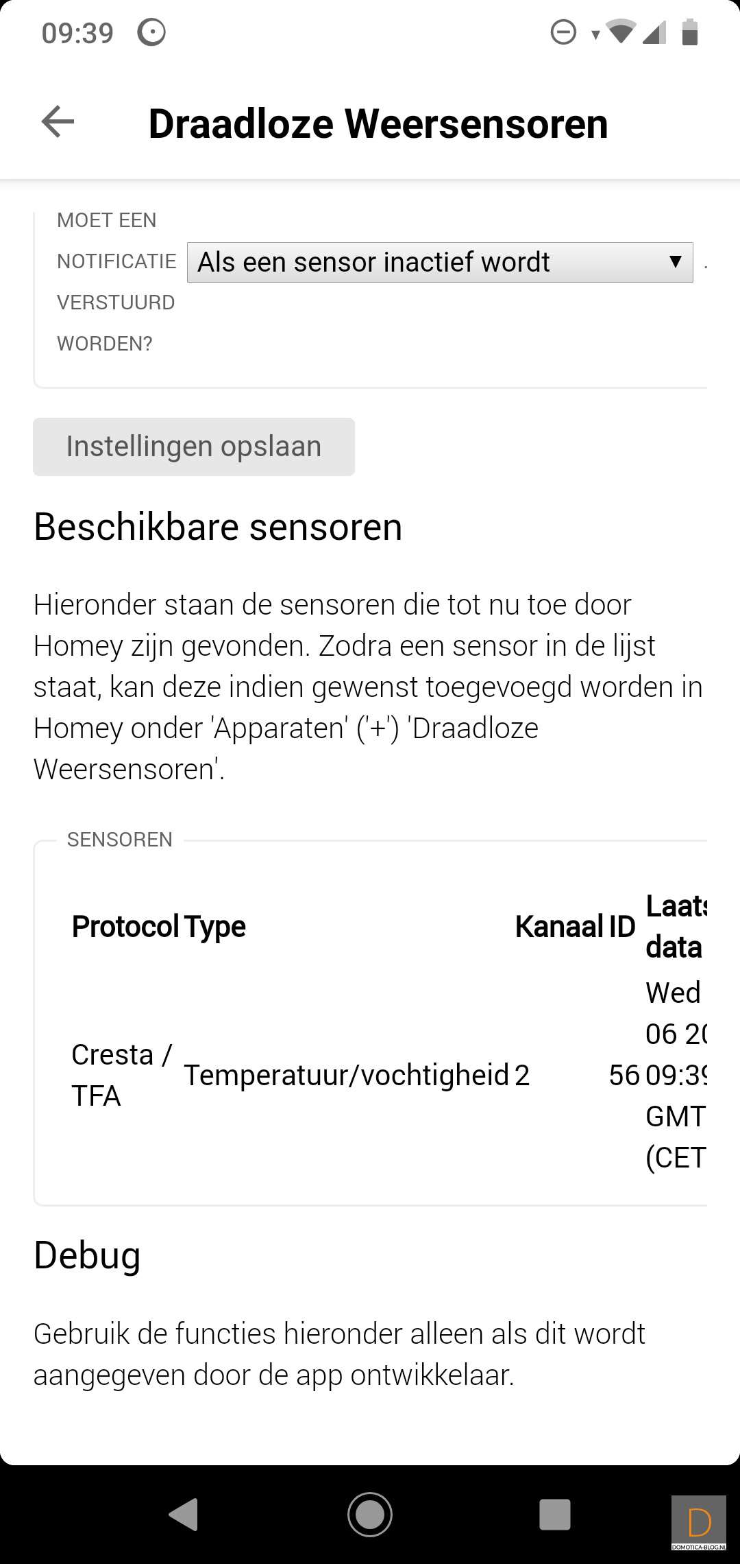 Dit is een zeer bekende en goedkope (€15,-) thermometer van Cresta. Om hem te installeren moest ik de weerstation APP installeren. Na even geduld werd hij gevonden. Helaas is 433Mhz niet zo betrouwbaar want na een tijd kwam het signaal al niet meer binnen.
