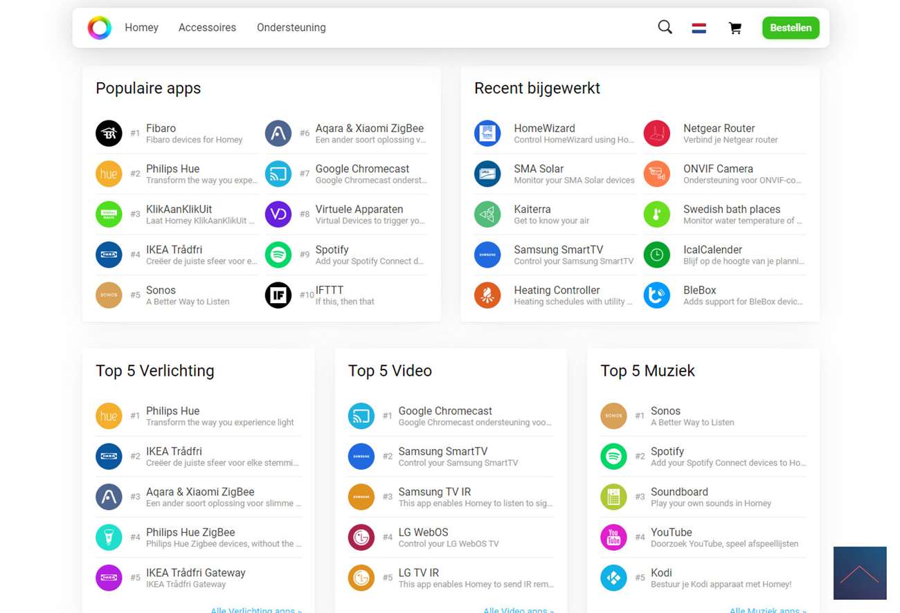 Zoals al gezegd is het mogelijk om APP's te installeren op de Homey. In het APP gedeelte vind je alle geïnstalleerde APP's en een link naar de store (https://apps.athom.com/). Homey is een open platform waardoor het mogelijk is om zelf ook APP's toe te voegen. Meer controllers hebben deze mogelijkheid (Fibaro/Vera) het probleem hiermee is dat deze APP's vaak niet door een interne programmeur gemaakt worden. Hierdoor kan de kwaliteit weleens niet op orde zijn. En als de programmeur er geen zin meer in heeft worden deze problemen vaak ook niet opgelost. Voordeel is uiteraard dat iedereen wat kan toevoegen en er soms hele leuke en handige dingen worden gemaakt.
