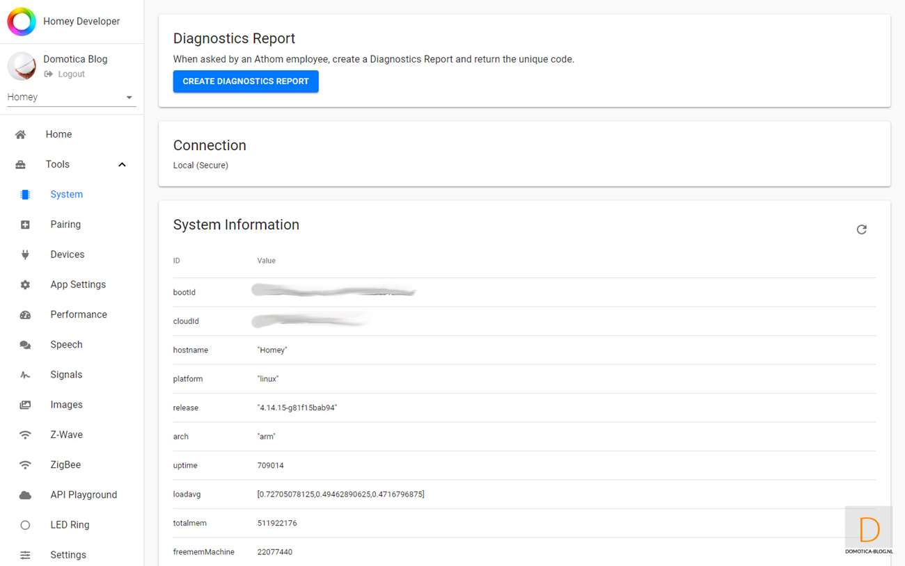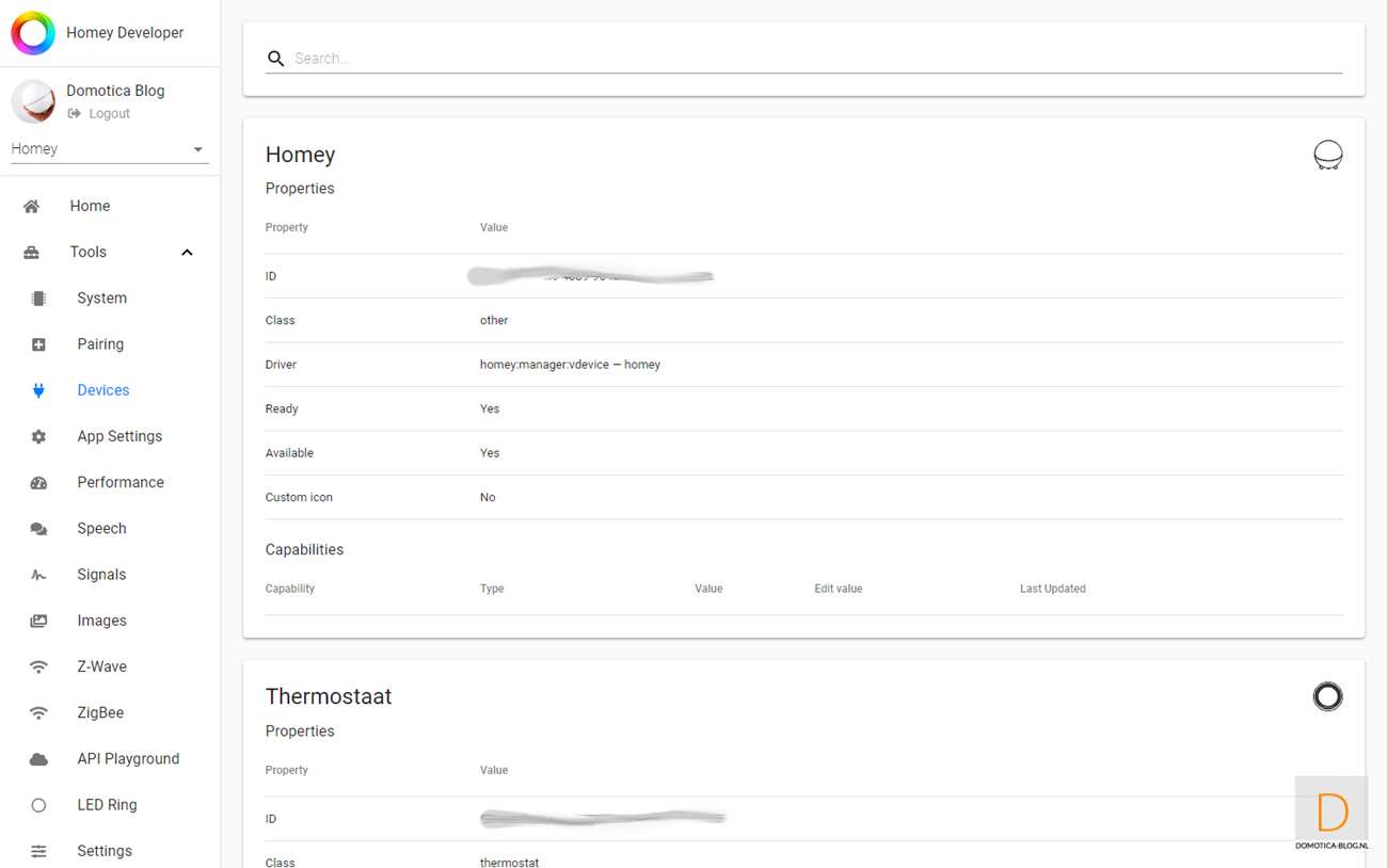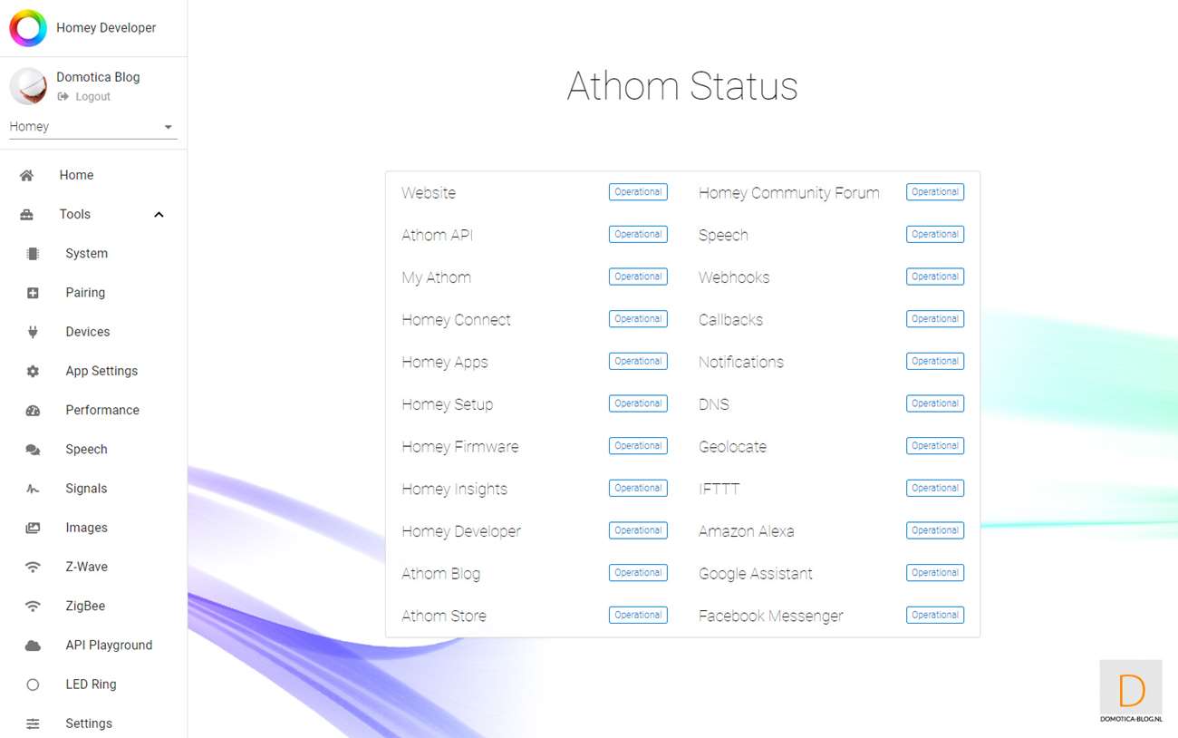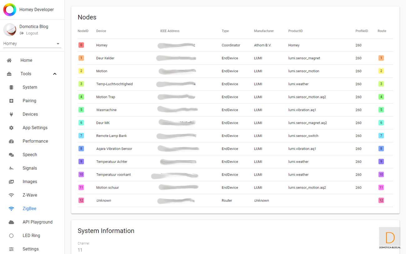 Naast de APP is er ook een webgedeelte van de Homey. Athom noemt dit het developers gedeelte. Hier kun oa de homey herstarten, de performance inzien en systeemgegevens bekijken. Daarnaast vind je al de apparaten hier (Z-Wave, BT, Zigbee en 433Mzh) en kun je een uitgebreid overzicht krijgen van je netwerk. Zo kun je zien wat je netwerkconnectie is tussen de verschillende apparaten. Je vind hier ook je netwerkheal om je netwerk opnieuw te kunnen opbouwen. Zeer handige feature om te zorgen dat alles goed blijft werken.