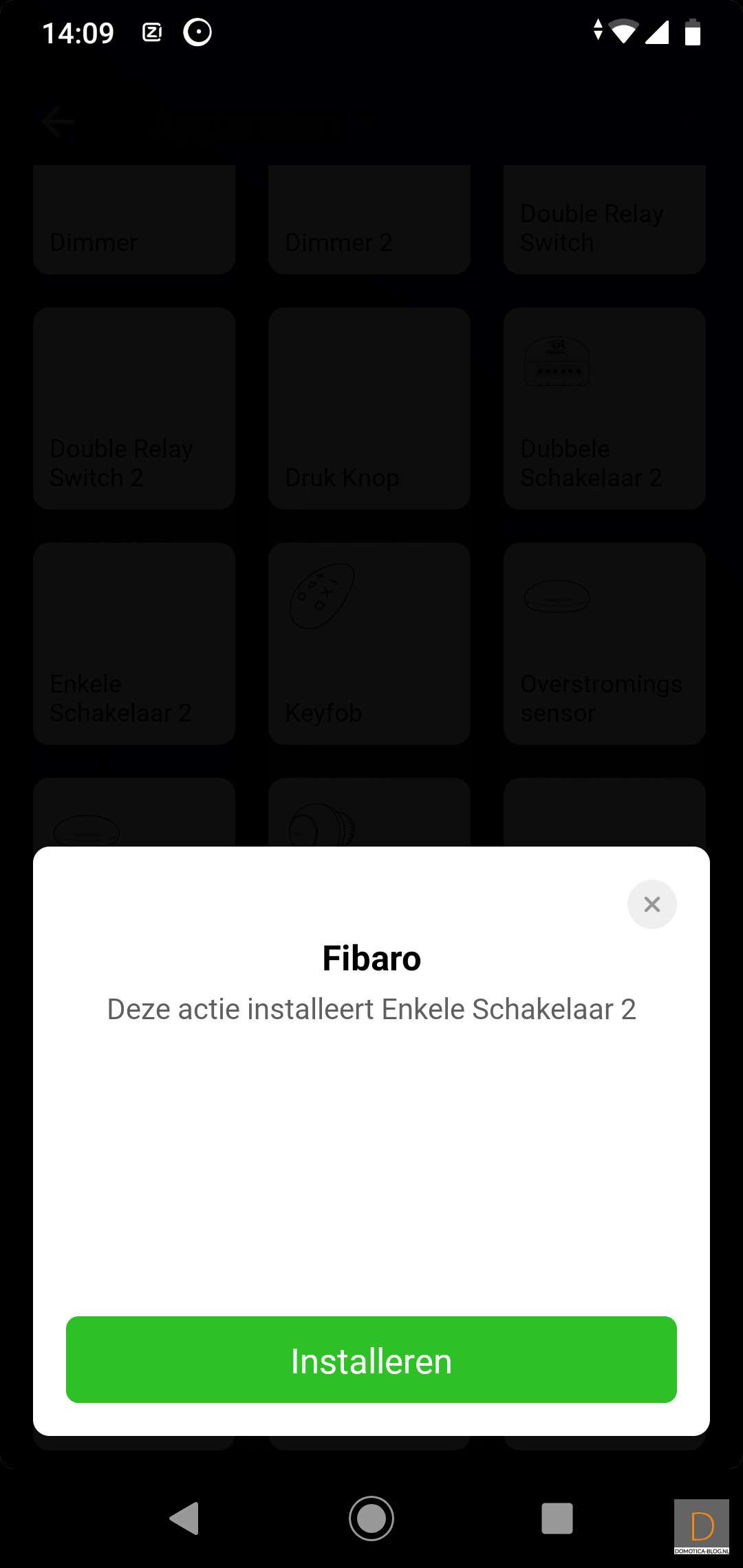 De schakelaar van Fibaro worden heel veel gebruikt in Z-Wave systeem. Dus het is goed om deze even te testen. Ik verwacht hier geen problemen mij maar we zullen het gaan zien. Om het toevoegen te starten ga je naar je apparaten en klik je op het plusje. Je zoekt dan de Fibaro single switch 2 op en installeert de APP, mocht je deze nog niet hebben.