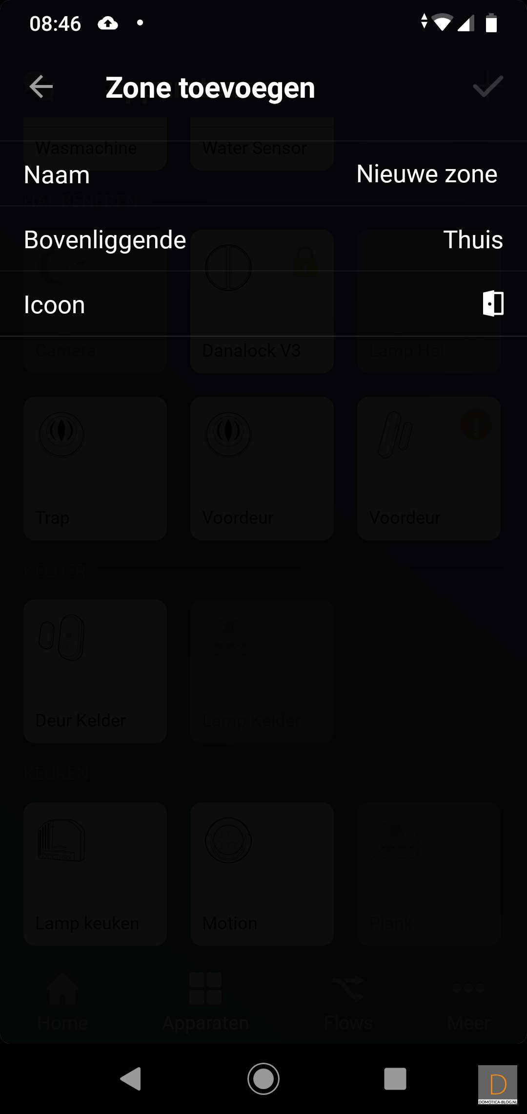Je kunt uiteraard ook zelf een nieuwe zone aanmaken door op apparaten te drukken en naar het radar icoon te gaan. Vervolgens kun je daar een nieuwe aanmaken door naar beneden te swipen. Aan de zone kun je ook een icoon hangen. Het is jammer dat het een kleine selectie is.