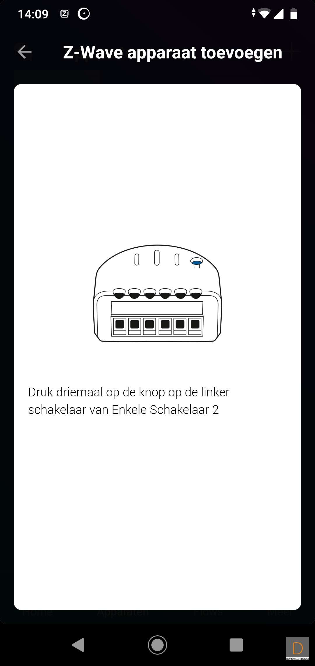 Hierna begint de reset procedure. Dit klinkt wat raar maar het is beter om elke Z-wave module eerst te resetten. Hierdoor wordt hij verwijderd uit een eventueel ander netwerk. Een Z-Wave apparaat kan namelijk maar aan 1 netwerk (controller) gekoppeld worden. Dit resetten kun je doen door 3x op het knopje aan de voorkant van de module te klikken. Als de reset gelukt is gaan we de dimmer echt toevoegen. Dit doe je weer door 3x snel op het knopje aan de voorkant van de module te klikken.