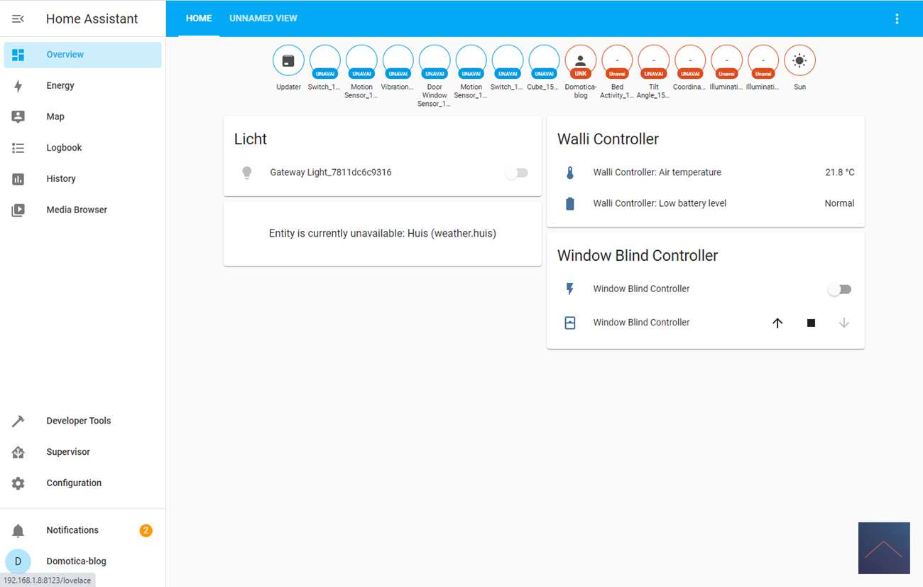 Om een automation te maken maak ik gebruik van de standaard functionaliteit welke in Home Assistant is ingebouwd. We maken, dat als de zon ondergaat en het 1 uur laten is, dat dan de jaloezieen dicht gaat.