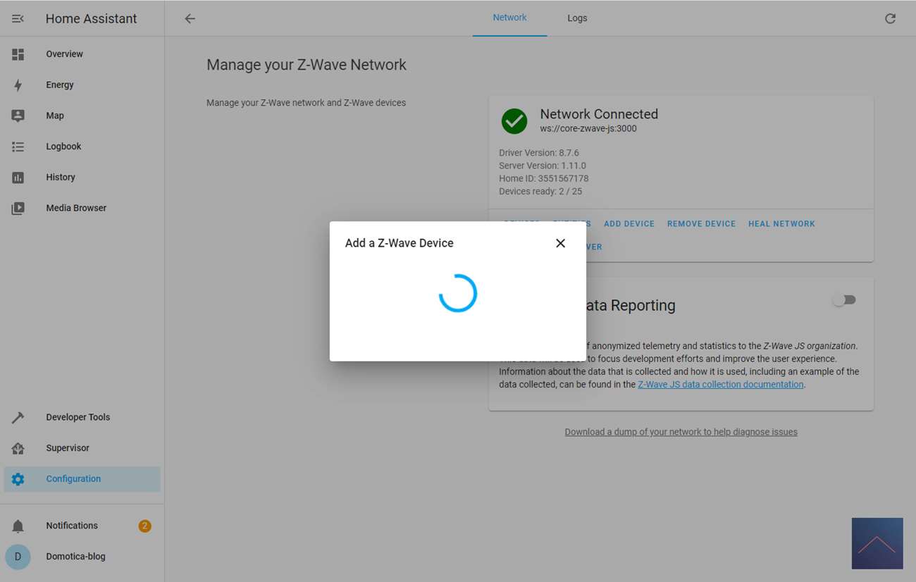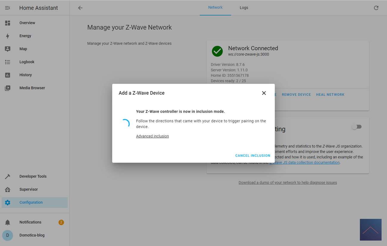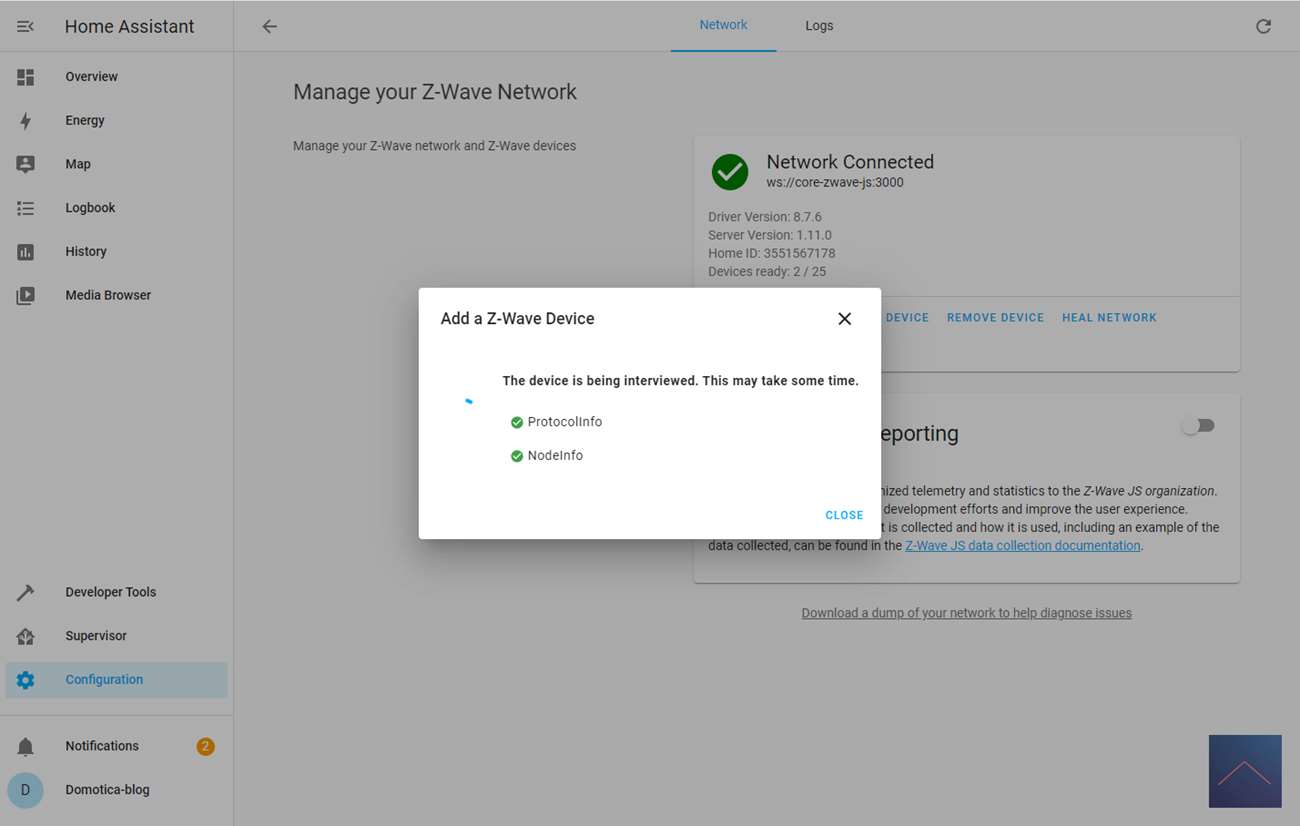Vervolgens starten we HASS op en gaan we naar je configuratie en hierna naar Z-Wave JS. Vervolgens klik je op "add device" om het toevoegen te starten. HASS geeft een korte melding dat het toevoegen is gestart.