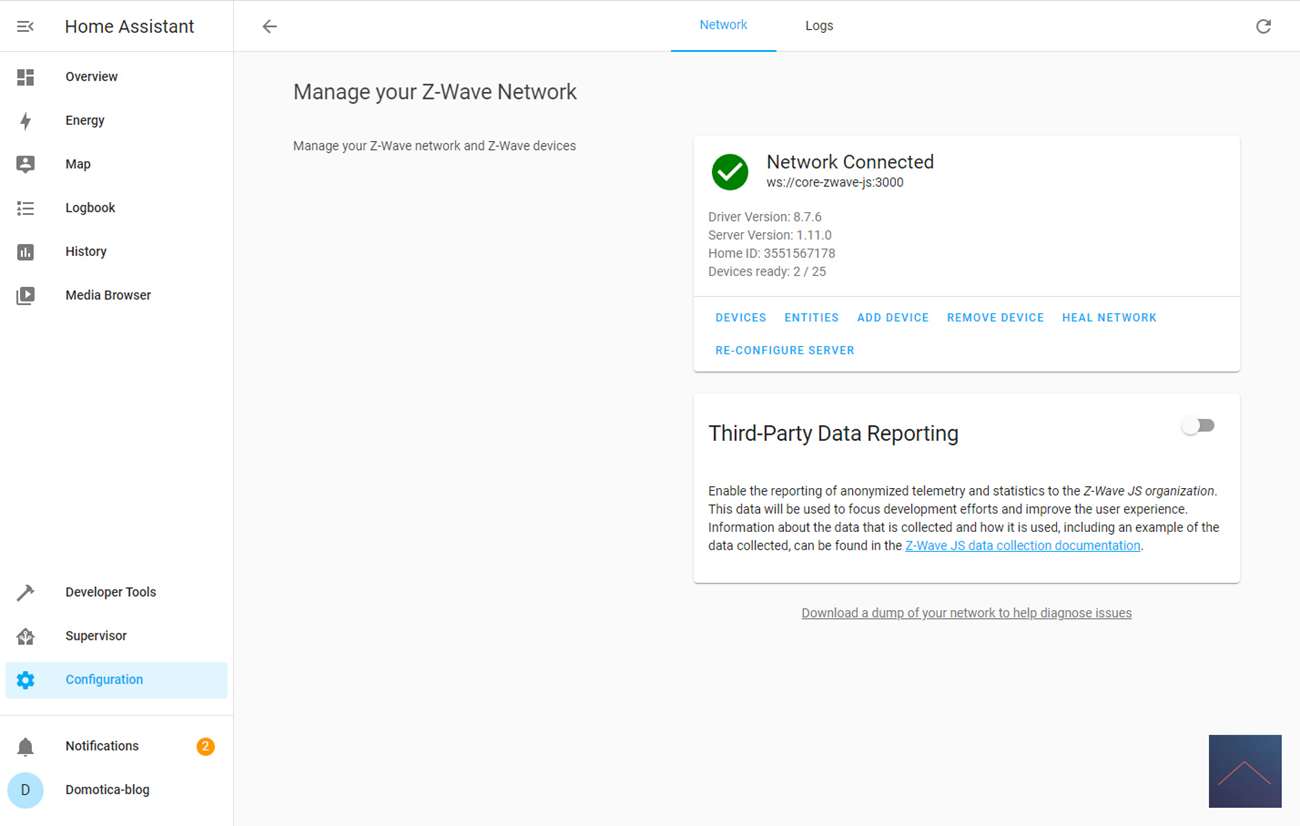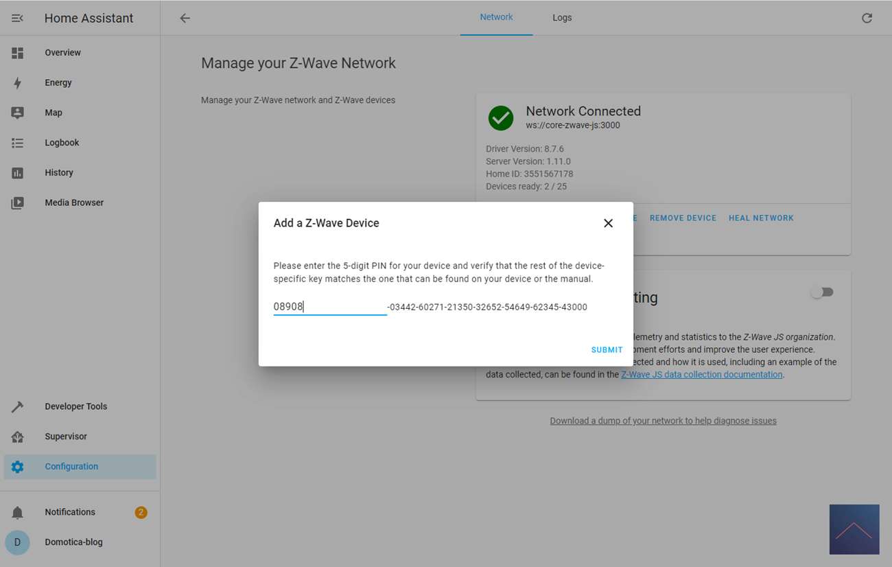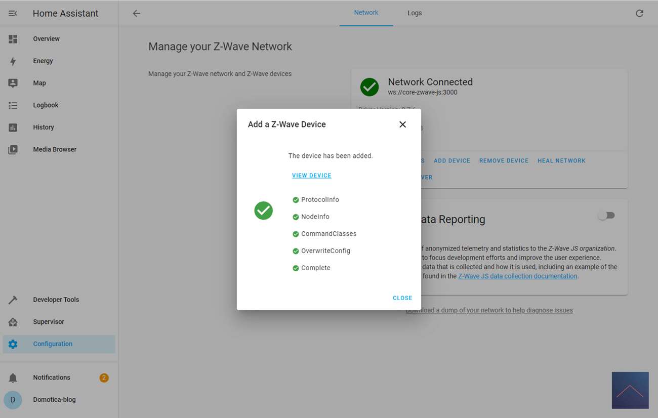 Vervolgens starten we HASS op en gaan we naar je configuratie en hierna naar Z-Wave JS. Vervolgens klik je op "add device" om het toevoegen te starten. HASS geeft een korte melding dat het toevoegen is gestart.