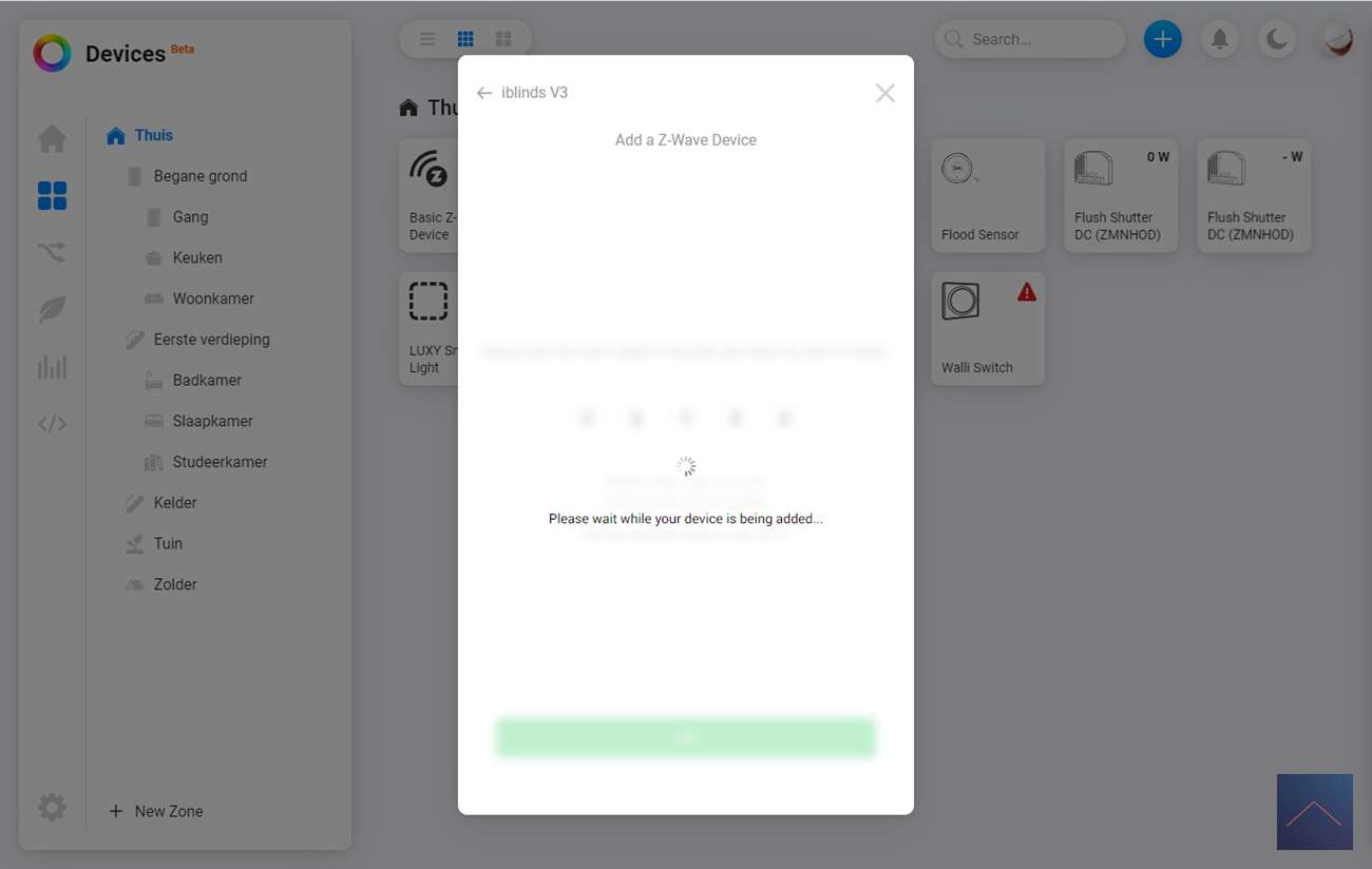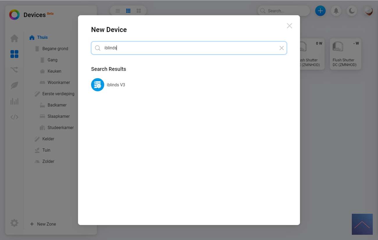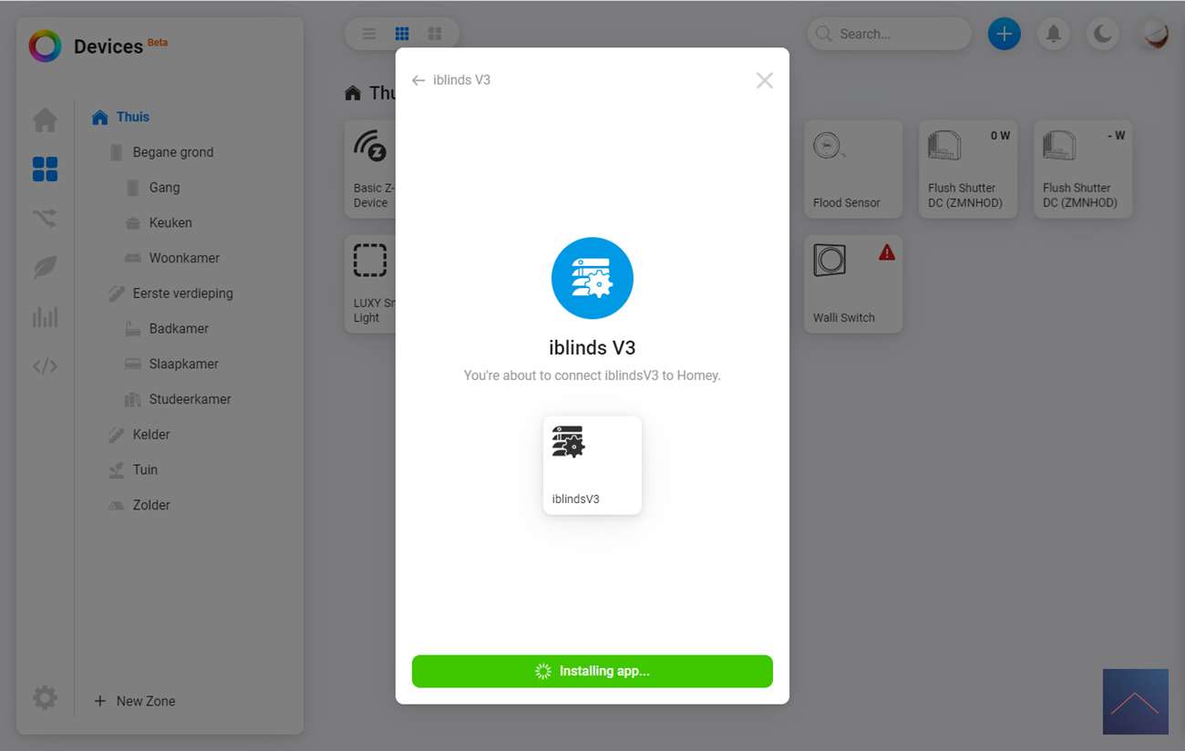 De eerste stap is om in te loggen in de webinterface (of de APP) van de Homey. We gaan vervolgens naar onze apparaten en drukken op het plusje. Ik zoek vervolgens op iBlinds en druk door om de APP te installeren. Volgens de instructie moet ik de iBlinds in de leermodus zetten. Dit kun je doen door het knopje (IN/EX) op de motor 3x achter elkaar in te drukkken of als je hem al helemaal hebt opgehangen het knopje aan de buitenkant (waar je hem ook kun opladen).
