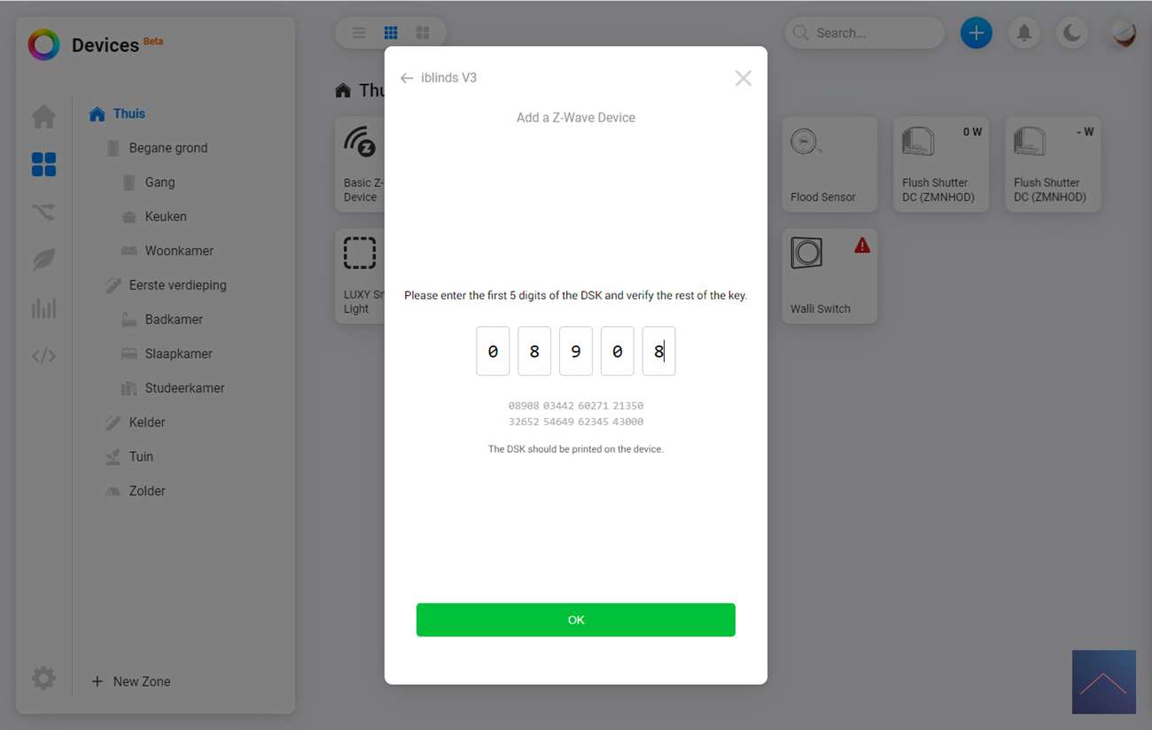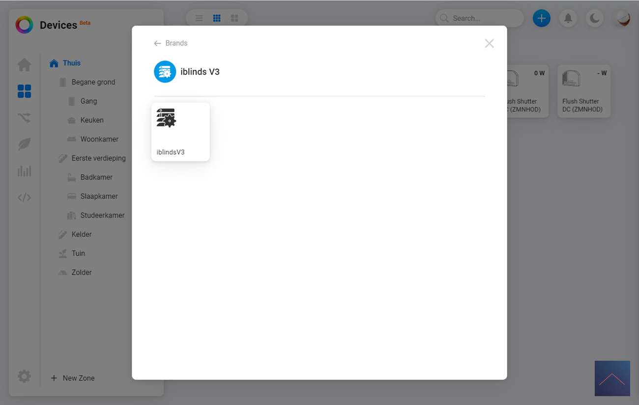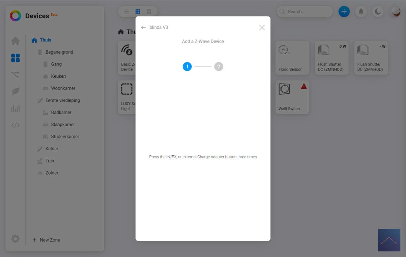 De eerste stap is om in te loggen in de webinterface (of de APP) van de Homey. We gaan vervolgens naar onze apparaten en drukken op het plusje. Ik zoek vervolgens op iBlinds en druk door om de APP te installeren. Volgens de instructie moet ik de iBlinds in de leermodus zetten. Dit kun je doen door het knopje (IN/EX) op de motor 3x achter elkaar in te drukkken of als je hem al helemaal hebt opgehangen het knopje aan de buitenkant (waar je hem ook kun opladen).