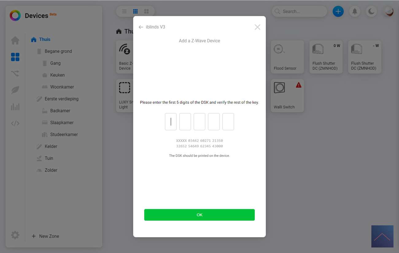 Je gaat hem hierna eerst verwijderen/resetten en dan toevoegen. Dit laatste doe je door weer 3x op de IN/EX knop de drukken. Ik zie hem direct en er wordt gevraagd om de SDK code. Deze kun je op het stickertje vinden welke bijgeleverd wordt of op de achterkant van de motor.