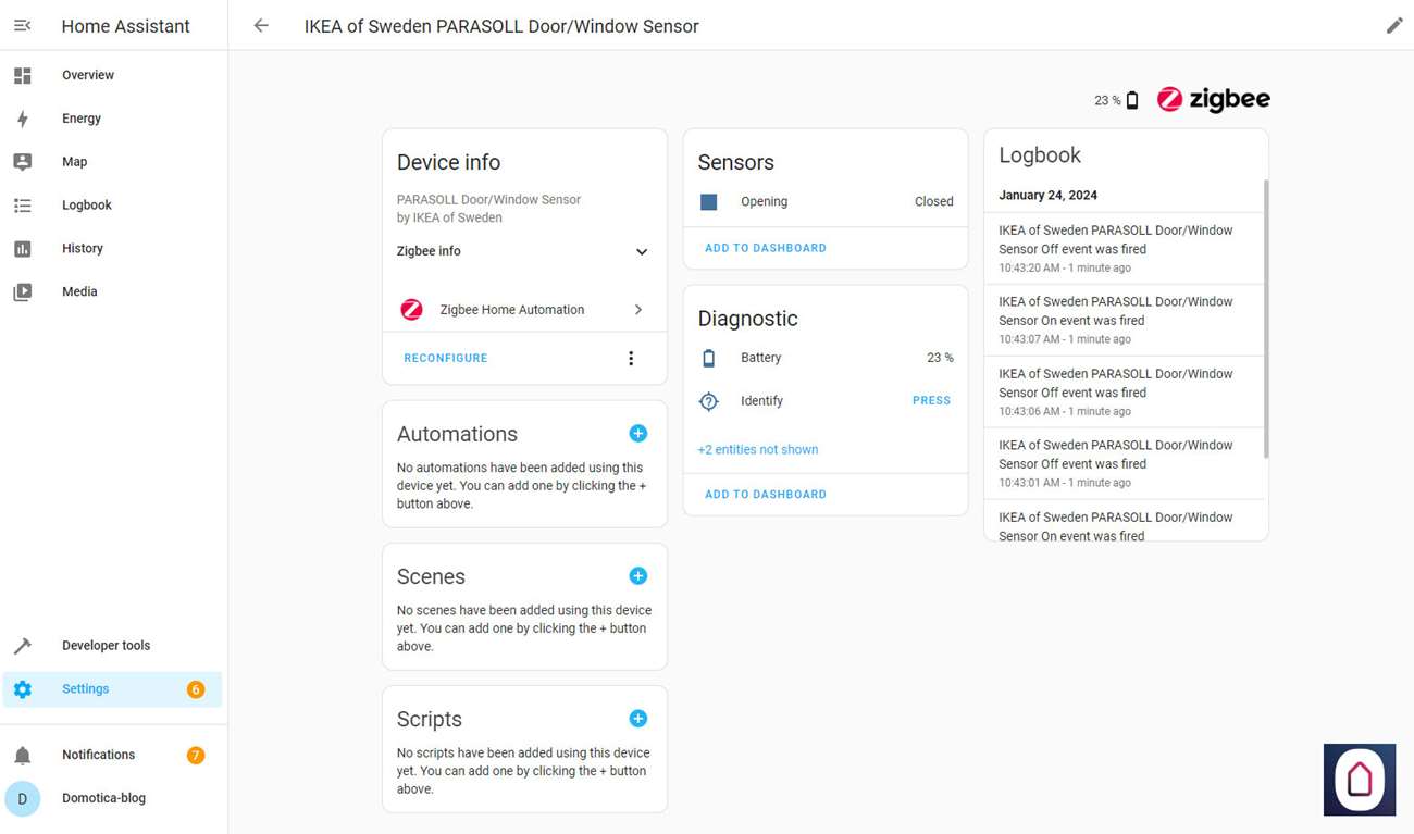 Als je de deur/raam open of dicht doet wordt er een signaal naar de Homey gestuurd van de status. Je kunt dus zien of de deur open of dicht is, je ziet tevens het batterijniveau.