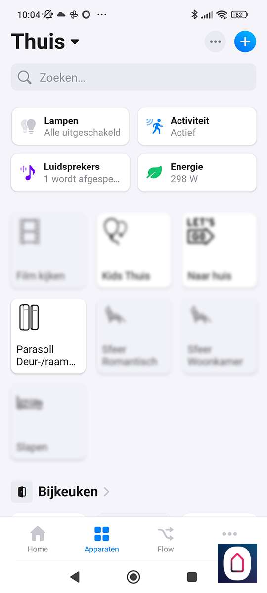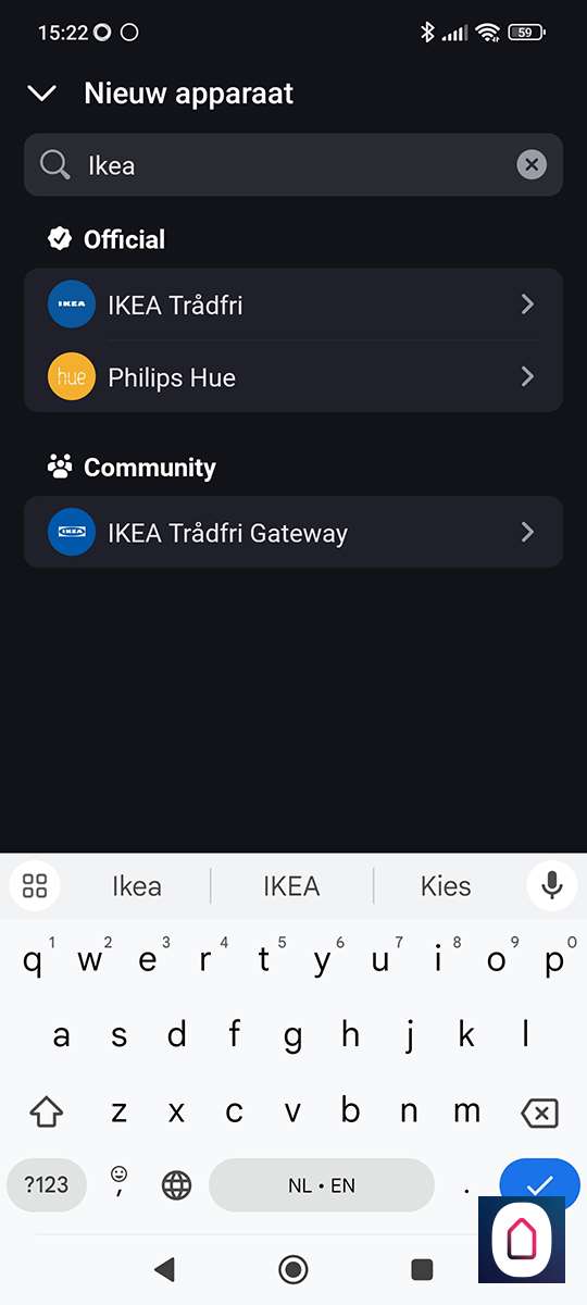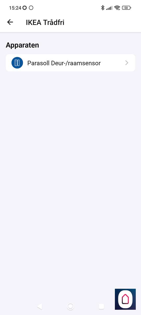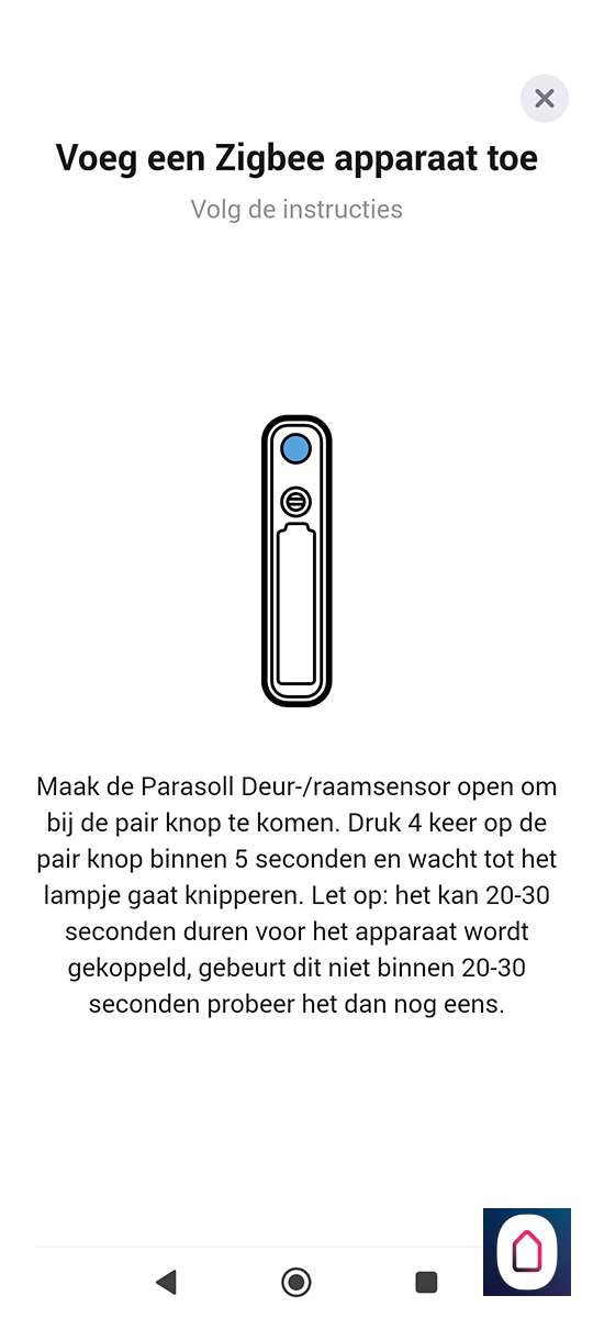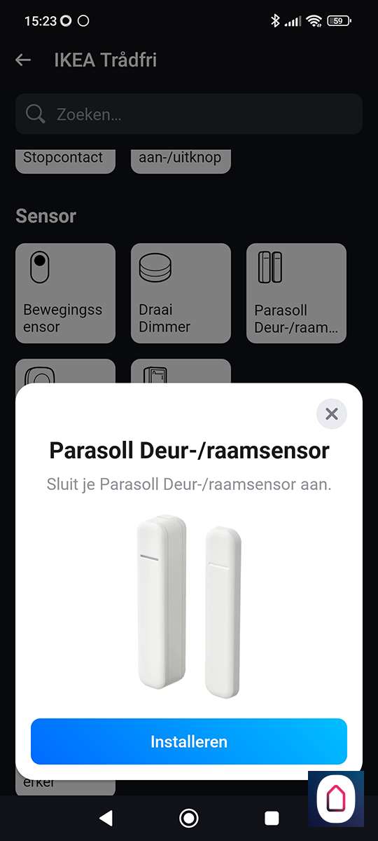 We halen eerst de beugel van de sensor af en maken het klepje open met een schroevendraaier. Nu plaatsen we een AAA batterij (mag ook oplaadbaar zijn), vervolgens starten we de Homey APP op en gaan naar onze apparaten. Hierna drukken we op het plusje en zoeken Ikea en selecteren we "Parasoll". De volgende stap is om 4x op het koppel knopje te drukken, de LED zal gaan knipperen en pulseren. Na enkele seconden werd hij gevonden en zien we hem helemaal compleet in de Homey.