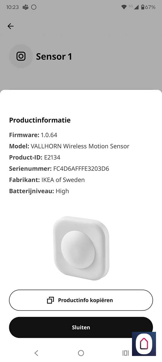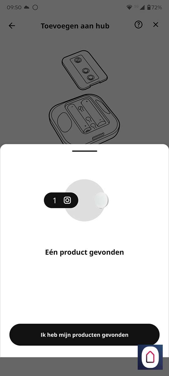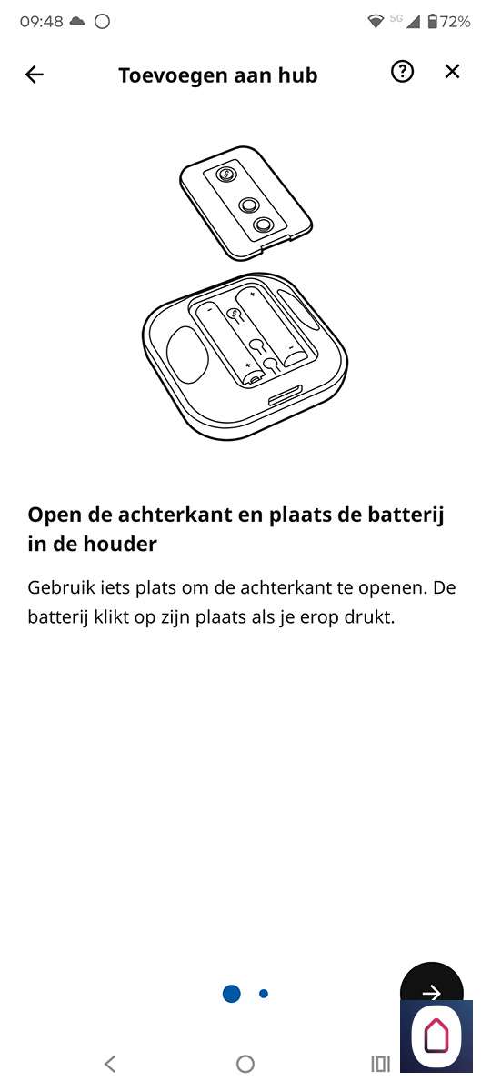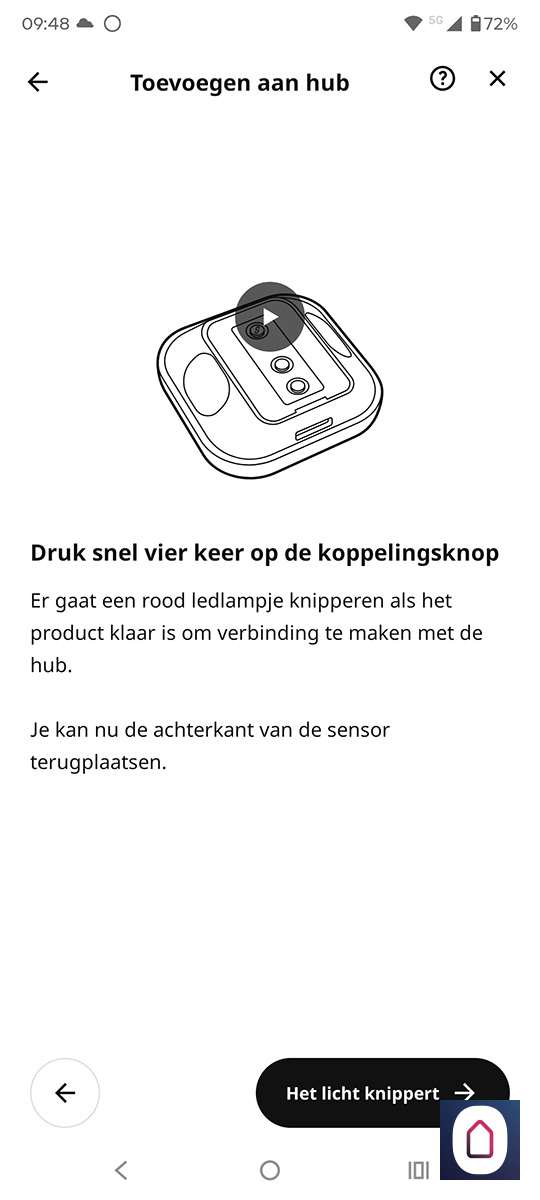 Installatie verloopt via de IKEA Home Smart-app en vereist een DIRIGERA-hub. Zonder die hub doet hij helaas niks. De koppelingsprocedure is eenvoudig: batterij erin, toevoegen via app, koppel knopje indrukken, de LED aan de voorkant zal gaan knipper en de hub led spint en dan best wel even wachten tot hij gevonden is. Hierna hadden we hem binnen enkele minuten opgehangen in onze hal.