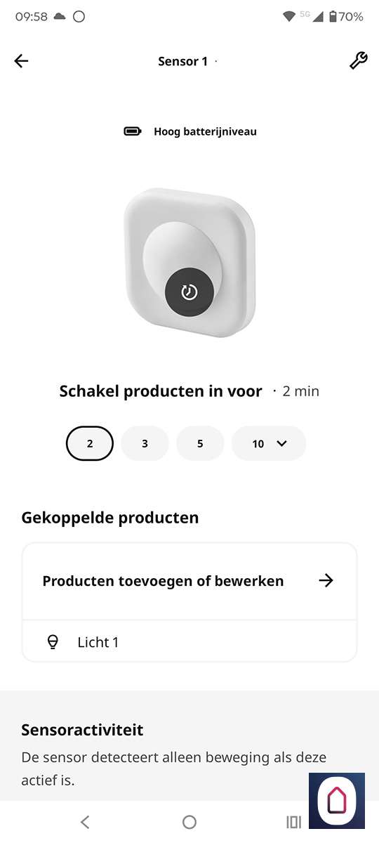 De sensor reageert inderdaad sneller dan zijn voorganger. Zodra we voor de sensor staan gaat de lamp direct uit. Via de APP kun je aangeven welke lampen er gekoppeld zijn (max. 10) aan de sensor en voor hoelang hij dan aan blijft (van 2 min tot 60 min.). Hij heeft een standaard time out periode van 20 seconde, dus zolang er binnen deze tijd beweging is zal de de lang aan blijven.