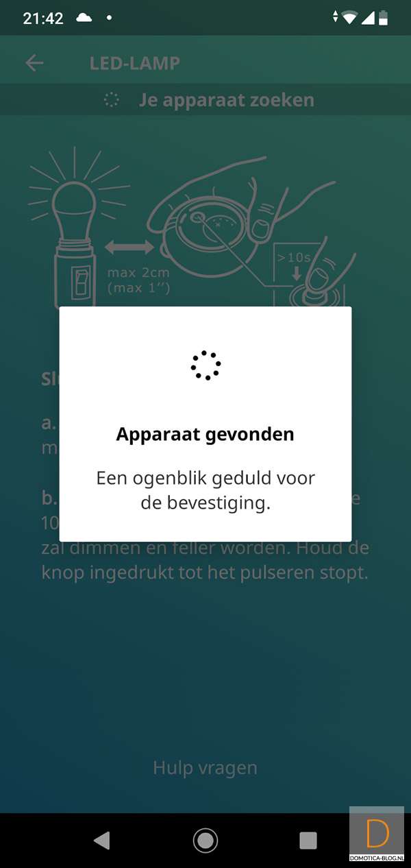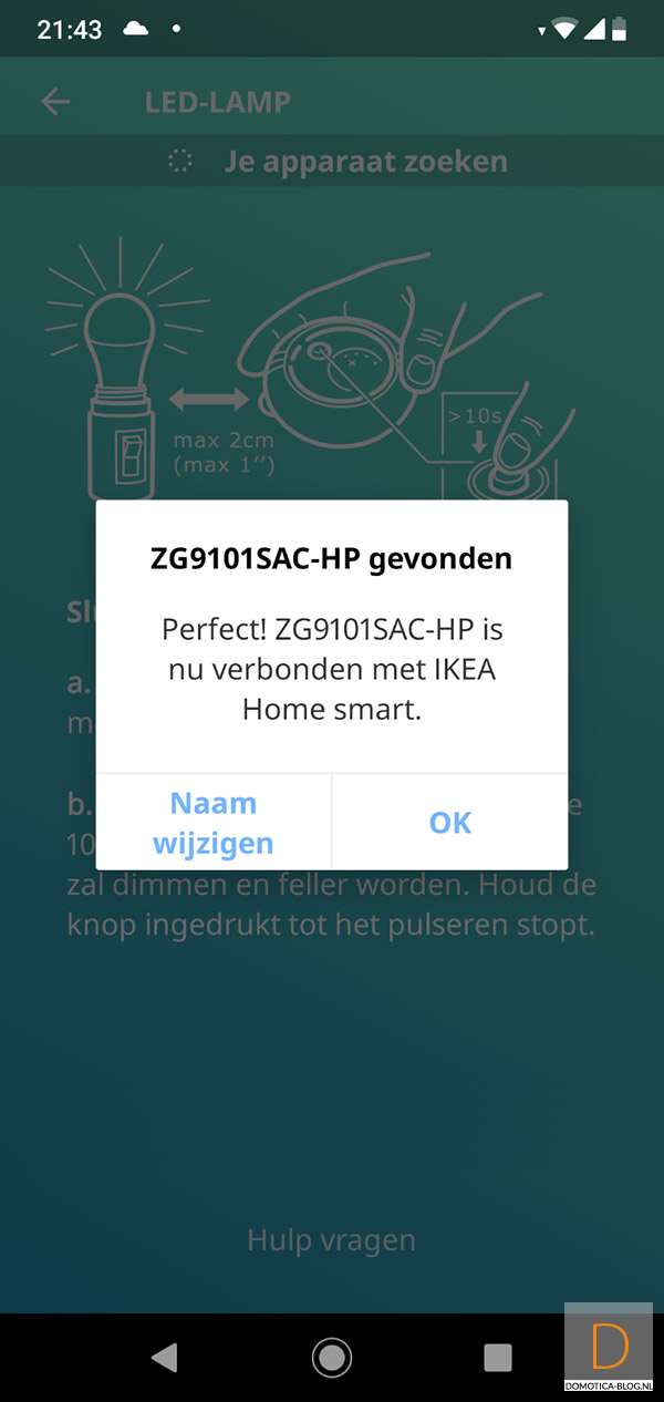 Ik zie hem verschijnen in 'mijn kamer' en kan hem aan- en uitzetten en dimmen. Met de door mij getest LED lamp (Ikea ledera) en 30W gloeilamp kreeg ik geen flikkeringen en verloopt het dimmen vloeiend.