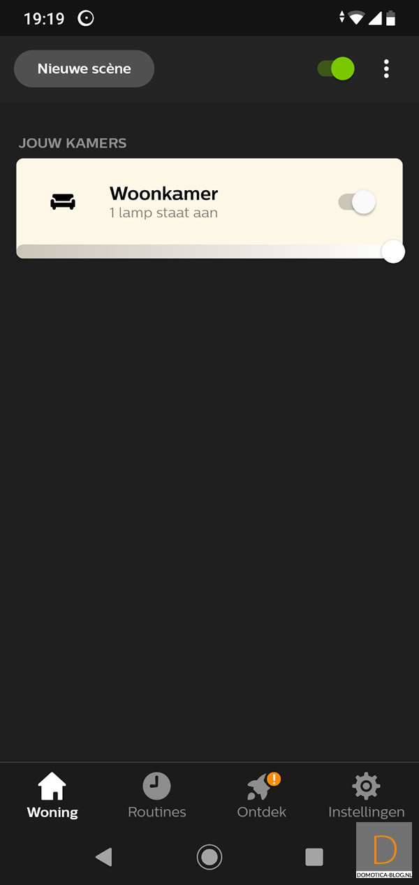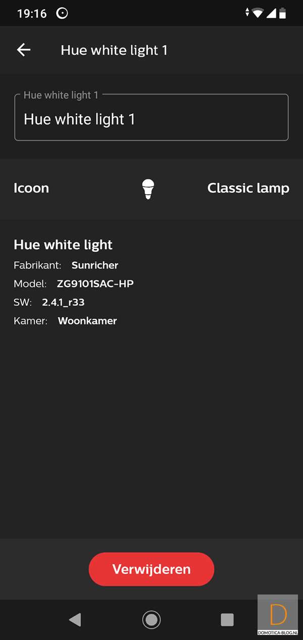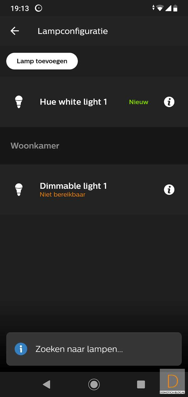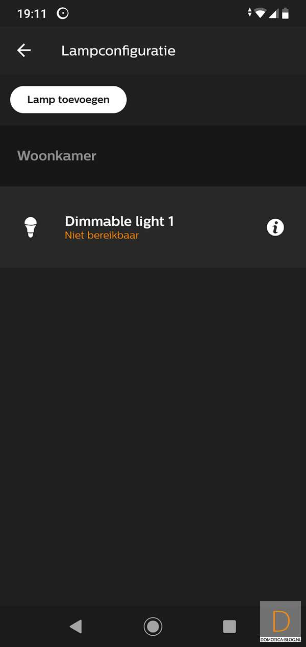 Bij ons werd hij netjes gevonden en zie hem bij mijn lampen te voorschijn komen. De lamp geeft overigens ook aan dat het toevoegen is gelukt door 3x in en uit te faden. Wat natuurlijk nog belangrijker is, is dat de lamp aan en uit gezet kan worden en dat je het dim niveau kan bepalen. Met de door mij geteste LED lamp (Ikea ledera) en 30W gloeilamp kreeg ik geen flikkeringen en verloopt het dimmen vloeiend.