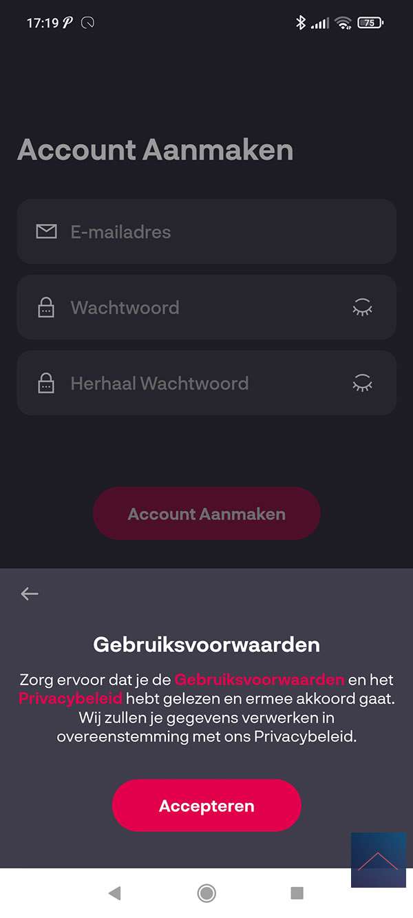 Nadat je de APP hebt opgestart moeten we ons registeren. Als we naar het privacy statement kijken zien we dat er wordt vermeld dat er geen data met derden wordt gedeeld. Dit geldt uiteraard niet als je een externe partij gebruikt. Het account moet geverifieerd worden door op een link te klikken die in de mail staat die je krijgt toegestuurd.