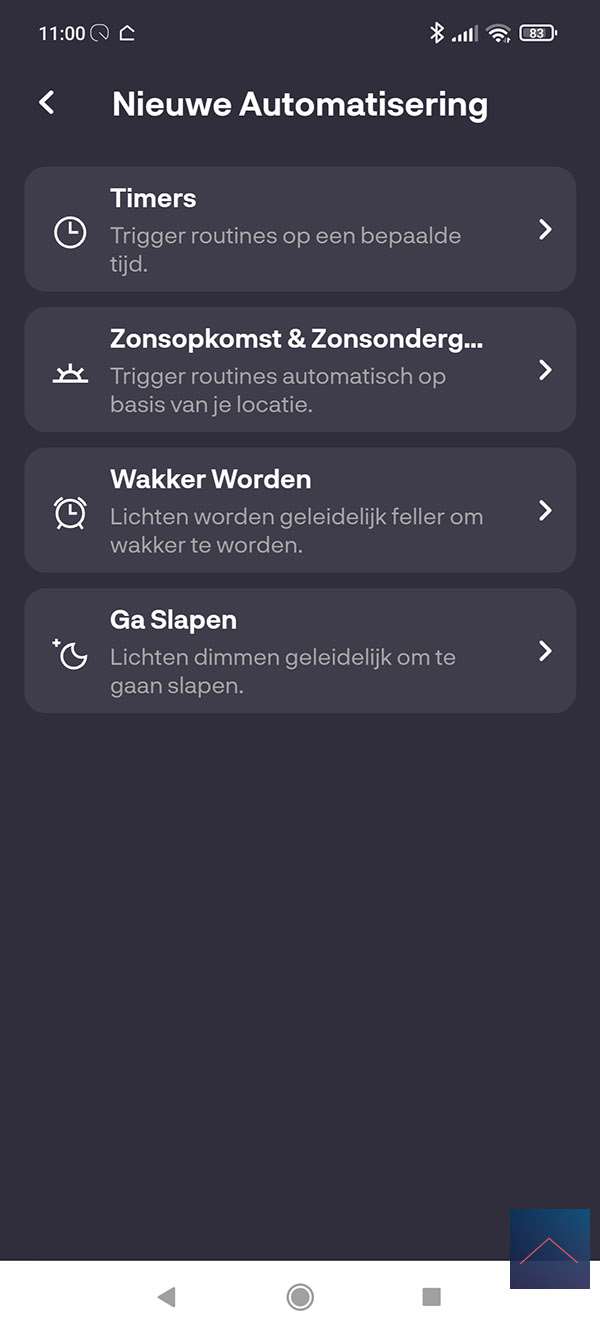 Je kunt hier ook weer zelf een automatisering maken. Hierbij krijg je de volgende triggers/startpunten tot je beschikking: Timers, zonsopkomst/zondondergang, wakker worden en gaan slapen. We bekijken ze allemaal even.