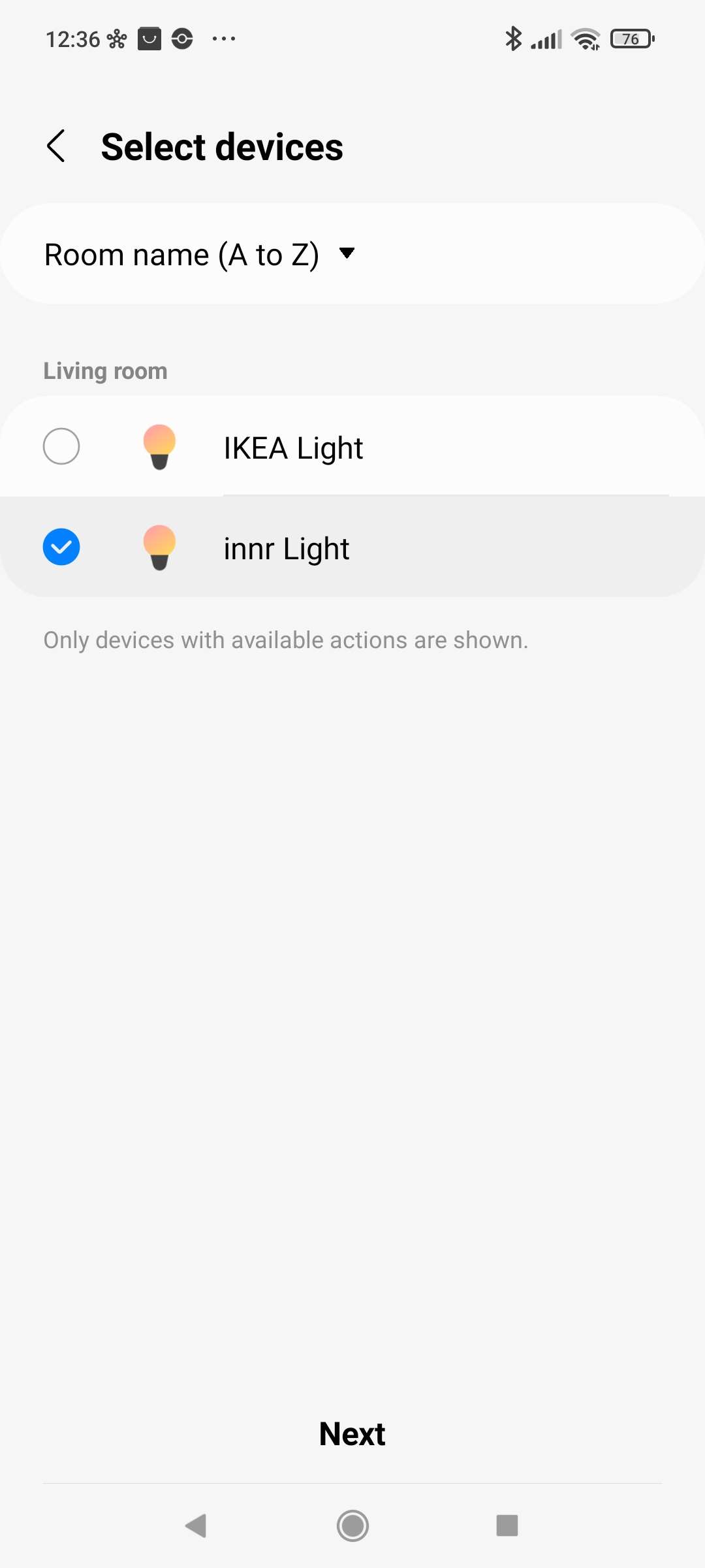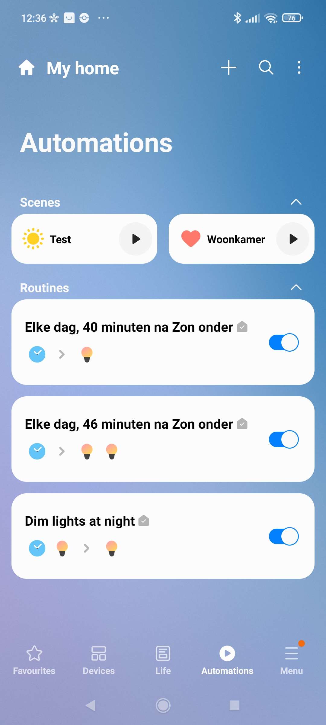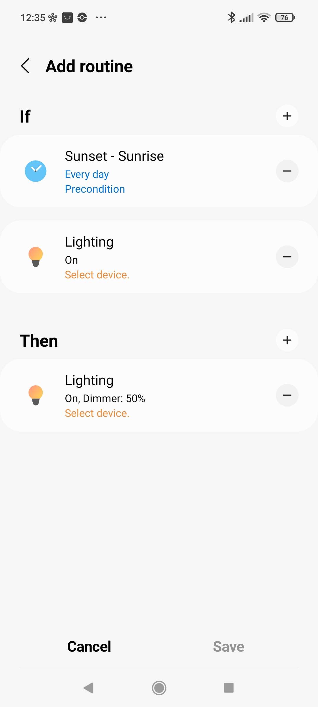 We willen dat deze lamp automatisch aan gaat als het donker is. Hiervoor kunnen we de ingebouwde routines gebruiken. Ga naar je routines en druk vervolgens op "ontdek" en swipe even naar beneden want daar vind je deze standaard routine. We geven vervolgens aan dat het om de INNR lamp gaat en drukken op opslaan.