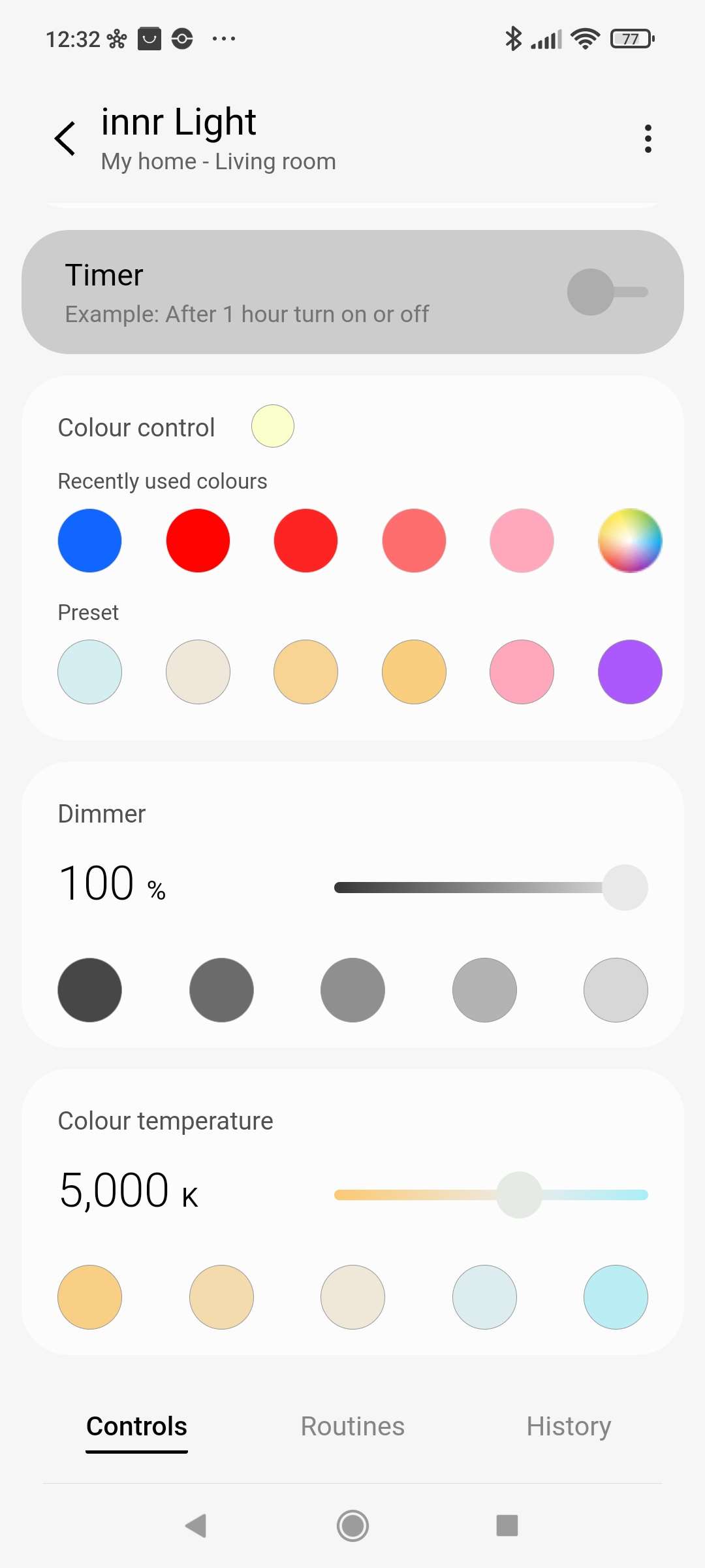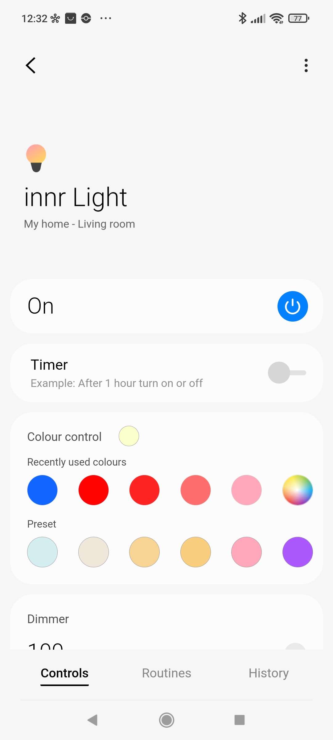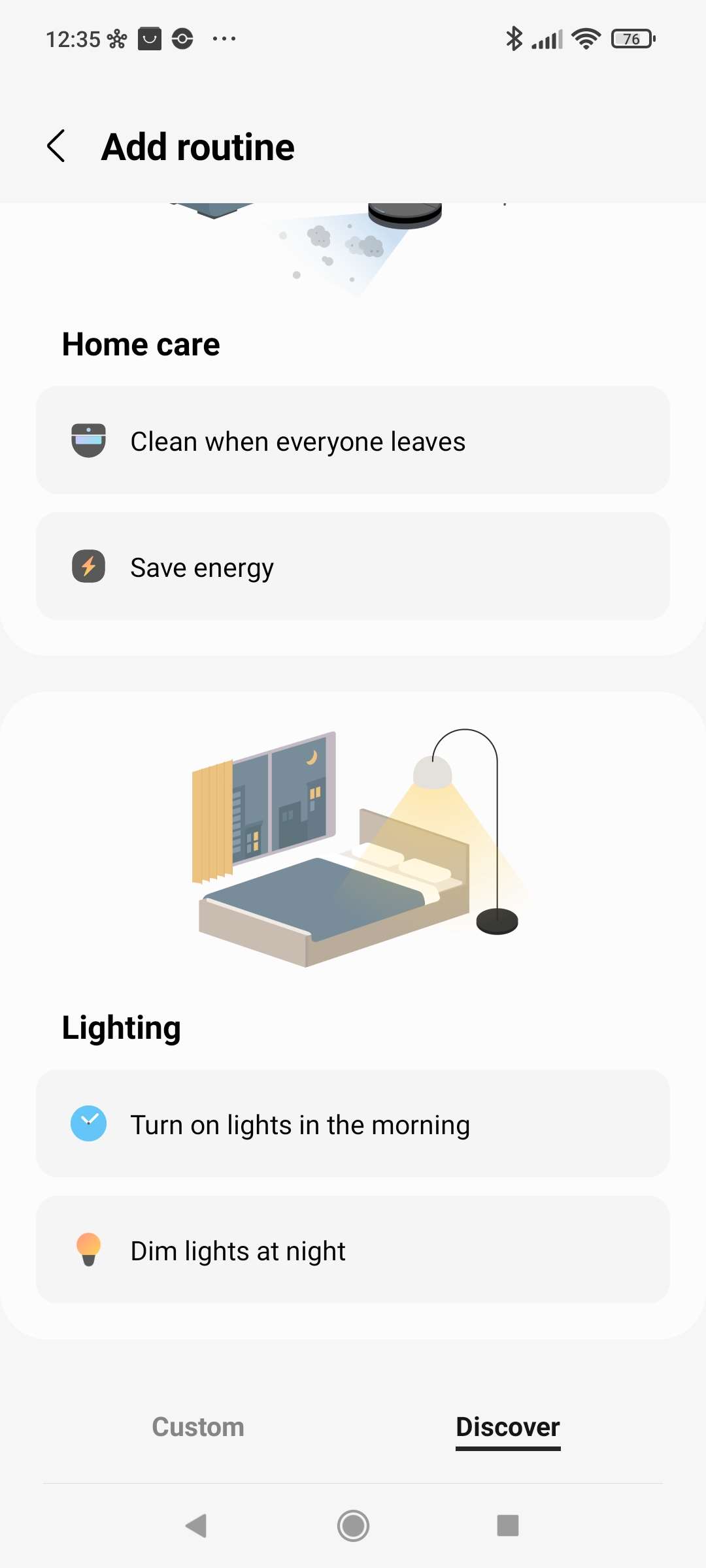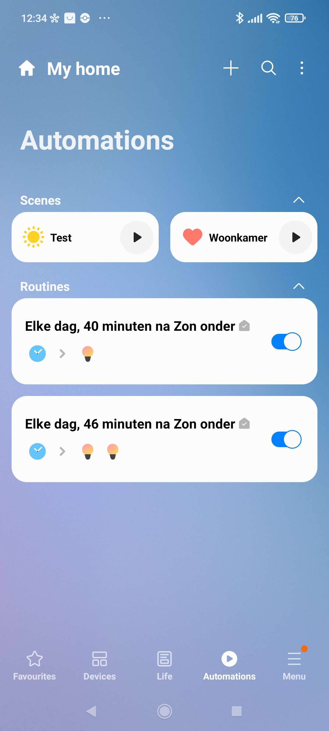 We willen dat deze lamp automatisch aan gaat als het donker is. Hiervoor kunnen we de ingebouwde routines gebruiken. Ga naar je routines en druk vervolgens op "ontdek" en swipe even naar beneden want daar vind je deze standaard routine. We geven vervolgens aan dat het om de INNR lamp gaat en drukken op opslaan.