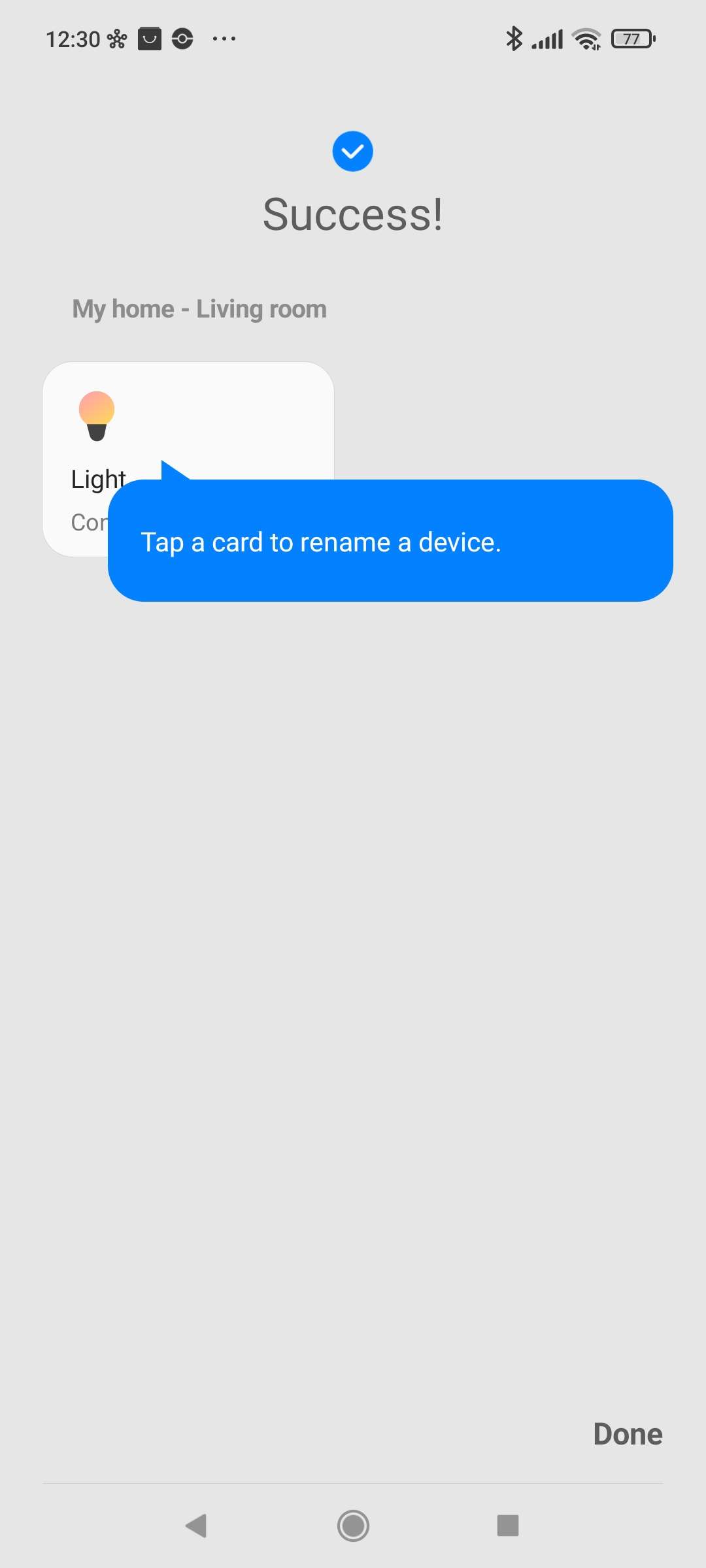 Na wat stappen voorzien we de lamp van stroom, deze zal van kleur veranderen. Na een paar seconden zie ik de lamp knipperen en geeft de APP aan hem gevonden te hebben. Mocht dit niet lukken dan moet je de lamp even resetten door hem 6 keer aan/uit te zetten.